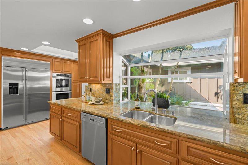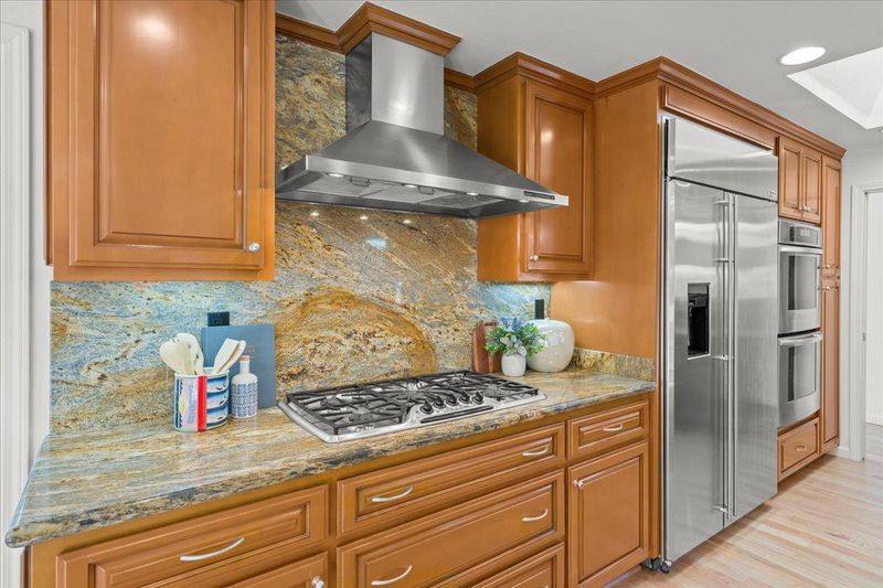 - Cooktop - Gas, Countertop - Granite, Countertop - Stone, Dishwasher, Exhaust Fan, Garbage Disposal, Hood Over Range, Microwave, Oven - Double, Oven - Electric, Refrigerator