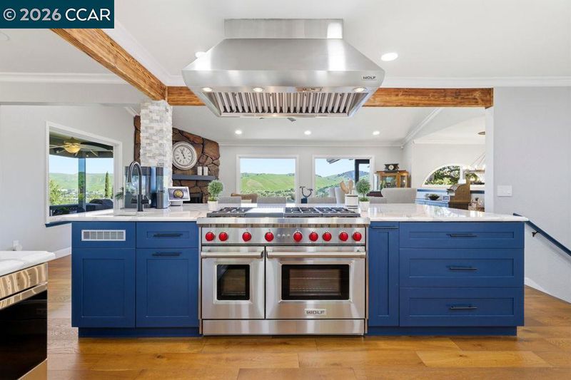 Perched on a private hillside with panoramic Diablo Valley views, this beautifully updated home is set on a .71-acre lot with mature oaks & terraced landscaping. The private driveway enhances the peaceful, tucked-away setting. The remodeled kitchen features premium Wolf appliances, generous counter space & a large island with bar seating, opening to the dining area for everyday living & entertaining. Wood flooring runs throughout the home. The living room features a fireplace & custom built-in cabinetry, while a separate family room with deck access provides space for relaxing or entertaining. Large windows bring in natural light & capture hillside views from nearly every room. Main living areas & bedrooms are located on one level. The primary suite offers direct deck access. The ensuite bath includes dual vanities, soaking tub, separate shower & walk-in closet. Three additional bedrooms share a hall bath & offer flexible space for guests or a home office. Outdoor living includes a spacious covered deck plus