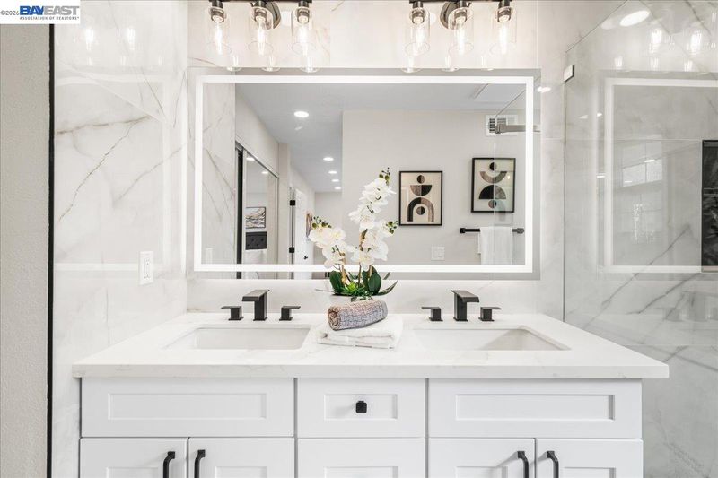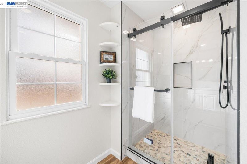- Shower Over Tub, Solid Surface, Split Bath, Stall Shower, Tile, Updated Baths, Double Vanity, Window