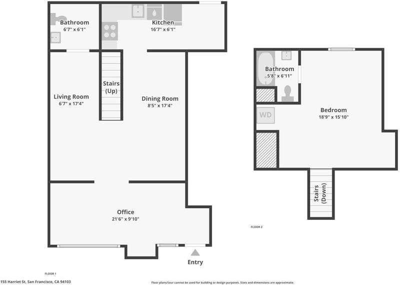 MUST SEE! Welcome home to one of the greatest values in this Vibrant Central SOMA location. Soaring 15 ft ceilings invite you into this two level 1 bedroom 1.5 bathroom Live/Work Loft spanning two levels. Floor to ceiling windows on the Eastern Wall bring an abundance of light, whilst frosted glass features offer privacy. Open floor plan for contemporary living, offering great many variations for living, dining, working and entertaining. New Stainless Steal Appliances include Fridge, Electric Range, Microwave with exhaust and Dishwasher. Large Bedroom Loft Area with Primary Bath on 2nd Level. Direct Street access for work uses or conveniences to 6th Street with security gate. Intercom controlled entrance on Harriet, and secured one car garage parking and courtyard complete the package. Close Proximity to Whole Foods, Costco, Giants Stadium, Chase Center and more. Convenient location with easy access to HWY 101 / 280 Muni and Bart systems.