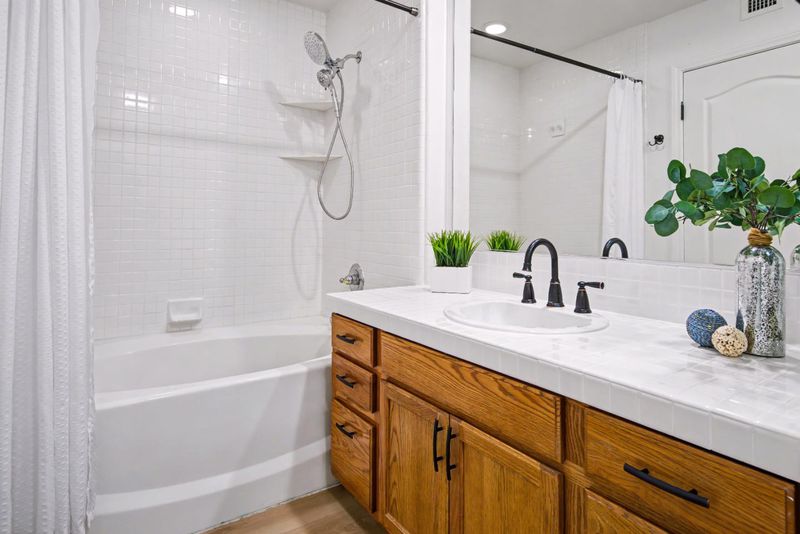 - Double Sinks, Half on Ground Floor, Shower over Tub - 1, Stall Shower, Tile, Other
