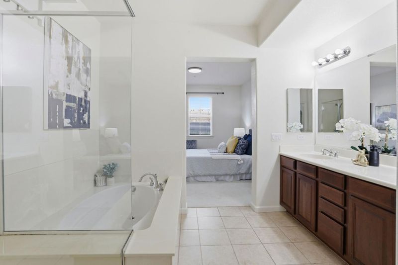 - Double Sinks, Stall Shower, Shower and Tub, Tile, Tub in Primary Bedroom, Full on Ground Floor, Primary - Oversized Tub, Primary - Stall Shower(s)