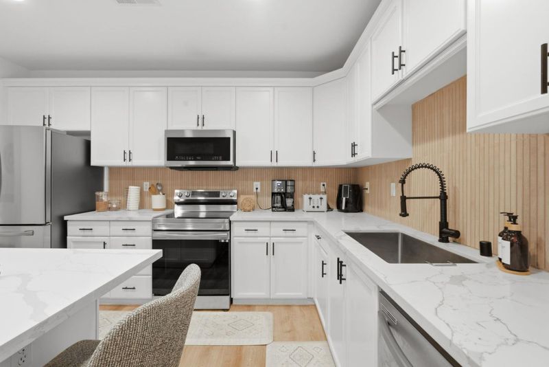 - 220 Volt Outlet, Cooktop - Electric, Countertop - Quartz, Garbage Disposal, Island, Microwave, Oven Range - Electric, Refrigerator