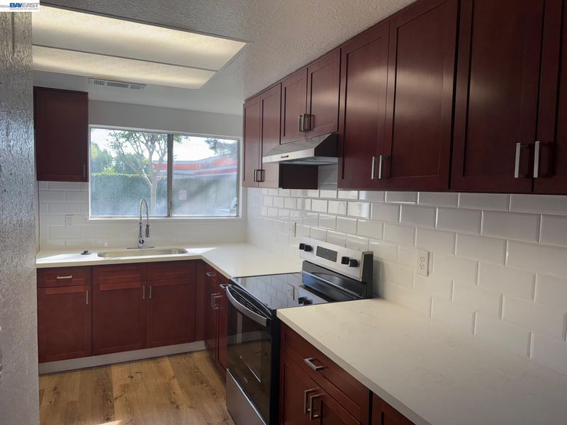 Completely remodeled and beautiful. Kitchen with cherry wood cabinets, quartz countertops and tile backsplash. Stainless steel sink and brand new range. Both bathrooms with cherry wood and quartz as well and also fabulously redone showers and shower doors. New flooring and painting throughout. New interior doors/hardware. All this in a 3 bedroom/ 2 bath condo in gated community !!! Large unit with 1,354 sf of living space, plus covered patio/storage. Laundry hookups inside unit. Gated pool/spa. Ideally located close to schools, shopping and Freeway !!! Carport and uncovered reserved parking.