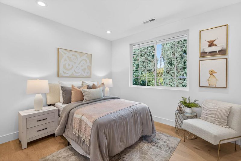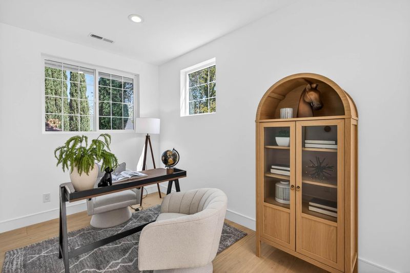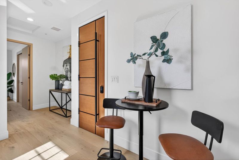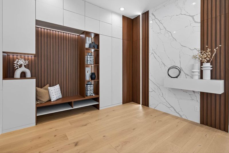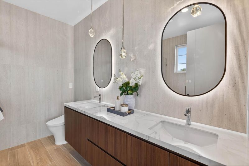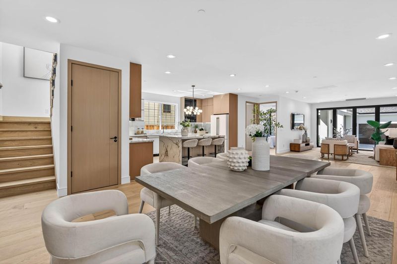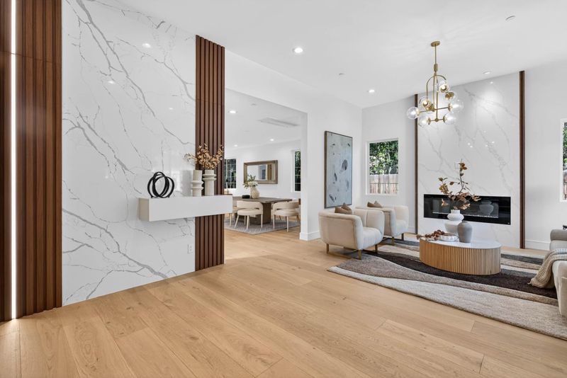 A brand-new modern home features a modern wood front door. Inside, open layout, engineered hardwood flooring, large picture windows, recessed LED lighting, linear slot HVAC diffusers, & modern interior doors. A custom built cabinetry & a fluted wood panel accent wall with integrated lighting. The living room has a modern linear fireplace with slab surround. The spacious open-floor plan family room, dining area & kitchen features an oversized waterfall-edge island, Imported Spanish porcelain countertop, 2-tone modern cabinetry with under-cabinet lighting, glass-front display cabinets, & stainless steel appliances: refrigerator, range with hood & LG dishwasher. Panoramic bifold glass doors. Bathrooms includes a frameless glass tile-surround walk-in shower with sliding glass door, shower niche, floating vanity, modern light bar, large-format accent tile walls, & TOTO toilet. A 2-story stairwell with large windows & designer chandelier leads to an open loft area with skylights. Bedrooms features custom cabinetry. The primary suite offers a high vaulted ceiling, while the spa-inspired primary bathroom includes a floating double-sink vanity, designer pendant lighting, skylight, freestanding soaking tub, frameless glass curbless walk-in shower, & Hansgrohe fixtures.