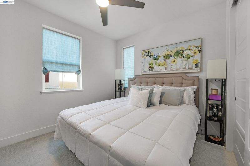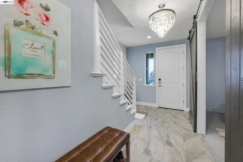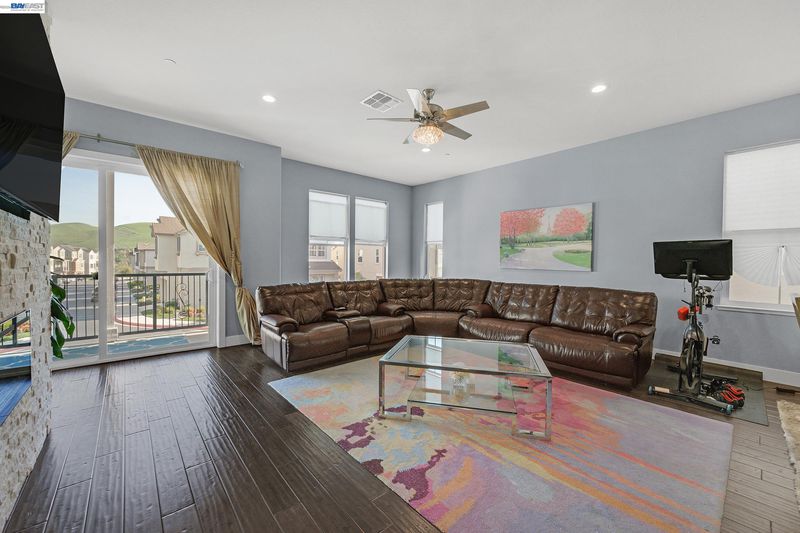 Don't miss the opportunity to live in one of Dublin's most desirable and sought after gated communities, Wallis Ranch. Suburban feel with urban amenities this 4 bedroom 3.5 bathroom home has been beautifully upgraded and welcomes you into the elegant entryway with two glittering crystal chandeliers. Gorgeous custom barn doors surround the entry to a large 2nd living room or forth bedroom/office with full bath and walk-in closet. To your right is a customized hardwood staircase leading up to the second floor with an open floor plan and casual elegance that abounds. Dark hardwood flooring a large living room with stone wall, electric fireplace, and dining space awaits you. The generous sized kitchen has been professionally and beautifully painted in a pristine white with champagne gold fixtures and has the much sought after large island and pantry. The adjoining space has room for a large dining table for entertaining or family gatherings or as displayed in the photos, pool anyone? Enjoy the view of the mountains from your second floor balcony or from the windows of the large primary suite which you will find on the third floor along with two additional bedrooms, 2 full baths, a laundry room and much more. Absolutely a must see!