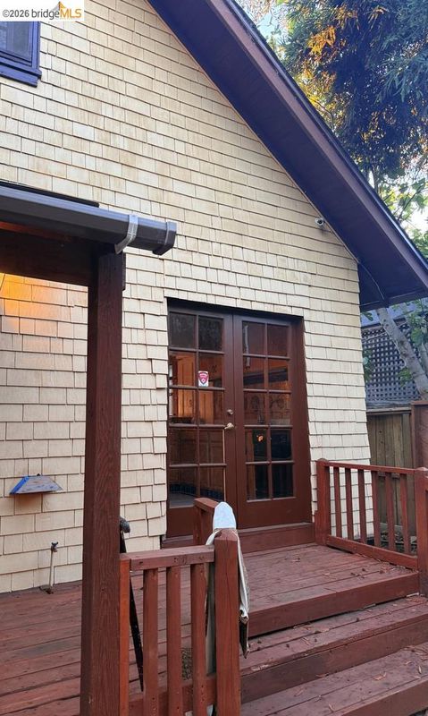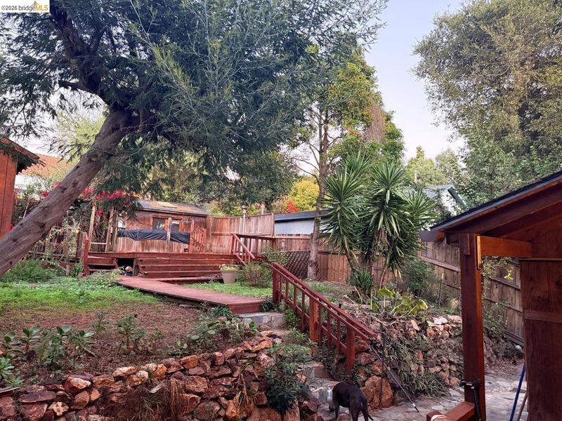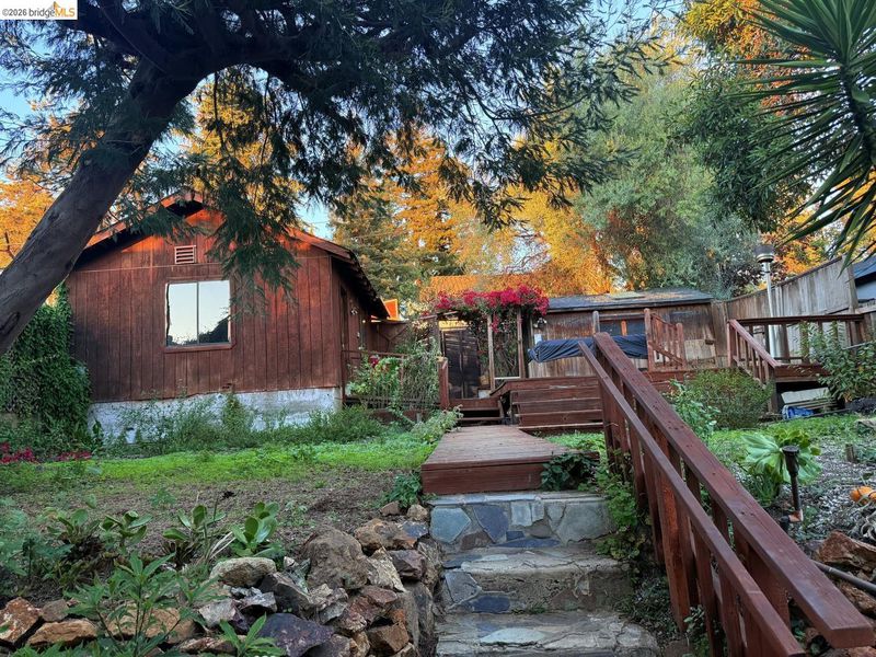 This is an opportunity to restore and customize a property, located in the Redwood Heights area in the Oakland Hills. Property includes a private yard with a Meyer Lemon, Orange, Fig and Avocado tree. Fully fenced and gated through lot, with dual street frontage, creating a property with access from two parallel streets. Additional features include a detached garage that opens from the street area, and has access to the interior of the property. Room for 3 parking spaces on property, plus the garage. There are two wood sheds. Deck with a hot tub. Hardwood floors throughout and tile in kitchen & bathrooms. Working wood fireplace in the living room. Bathroom has a 11' x 7' redwood sauna, a clawfoot bathtub, and shower stall. Decks off the living room & upstairs bdrm have views of the bay, bridges, & sunsets. Unfinished basement area of approx. 600 sf with over 8' high ceilings.