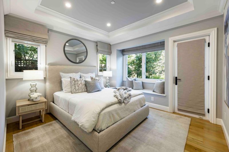 Graceful Mediterranean architecture and refined modern interiors define this beautifully crafted home, where clay barrel roof tiles and a stately arched entry create enduring curb appeal. Spanning more than 2,800 square feet across two levels, the home blends timeless character with contemporary design. Wide plank white oak floors, detailed ceilings, and elegant lighting create a luxe ambiance throughout. The living room features a curved window wall that fills the space with natural light and flows to the dining room and a stunning kitchen with a Thermador appliance suite. The adjoining family room centers around a fireplace set against a textured accent wall. Five bedrooms include a serene primary suite with private balcony and spa inspired bath, plus a guest suite and flexible main level bedroom. The peaceful backyard is ideal for entertaining. Close to Mitchell Park, Cubberley Community Center, Charleston Plaza, and top schools Fairmeadow, JLS, and Gunn (buyer verify eligibility).
