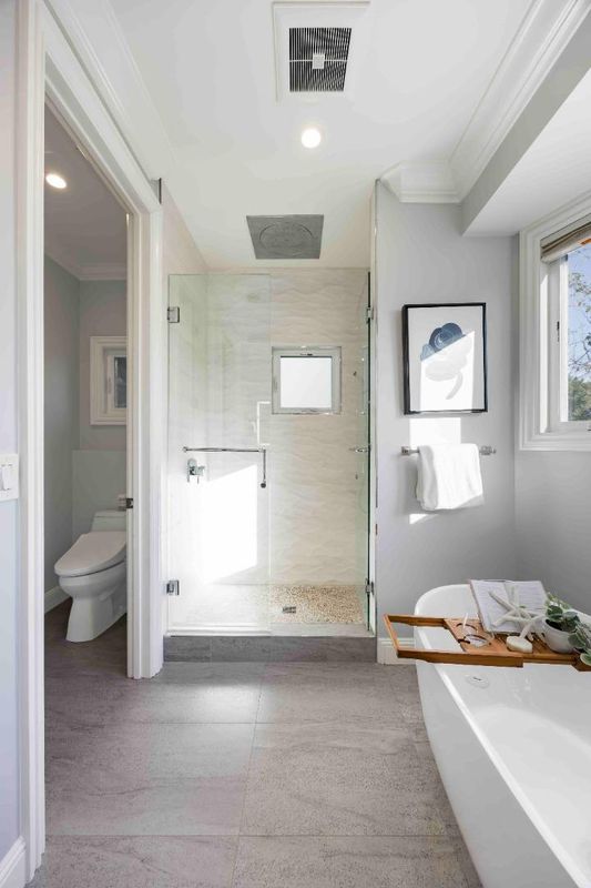 - Bidet, Double Sinks, Full on Ground Floor, Half on Ground Floor, Shower over Tub - 1, Solid Surface, Stall Shower - 2+, Tile, Tub
