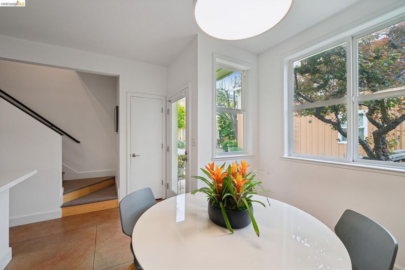 Modern Urban Oasis in the Heart of Temescal Discover enchanting and modern living at 480 42nd St, Unit E. Through the gate and beneath the blooming bougainvillea, a winding path leads you past verdant community gardens of vegetables and vibrant flowers on your way to Unit E. This intentional community of just six homes fosters community connections through shared outdoor spaces designed XO for gathering and relaxation. Constructed in 2000, Unit E is a townhouse-style condo that seamlessly blends contemporary farm-style with comfort. The interior features high ceilings, recessed lighting, and stylish finished concrete floors equipped with radiant heating on the ground floor, new wool carpeting up the stairs (2026), and bamboo flooring throughout the 2nd floor. On the ground floor, the bright, eat-in kitchen is perfect for meals and homework alike. High ceilings and natural light create a peaceful space to breathe and relax after a long day.