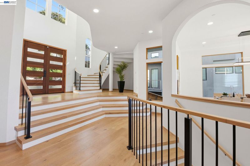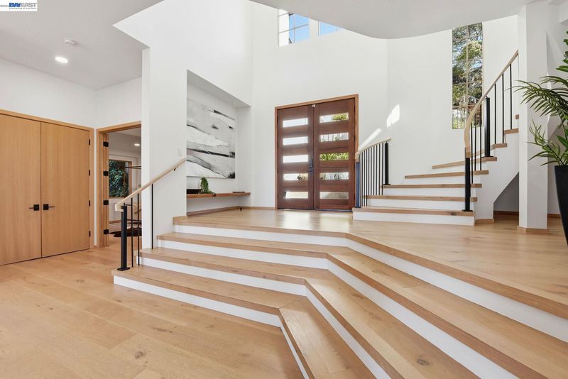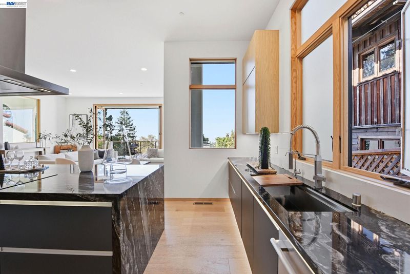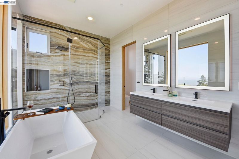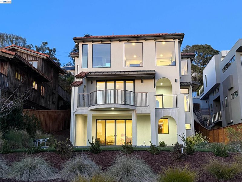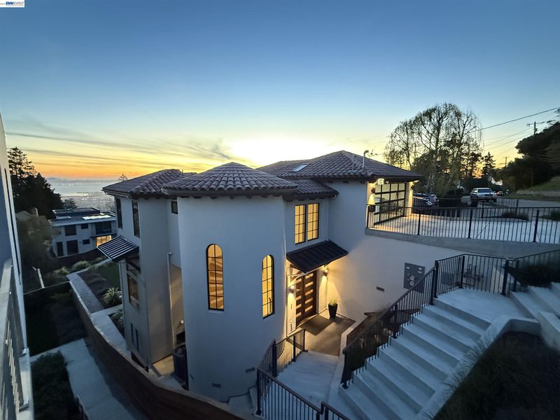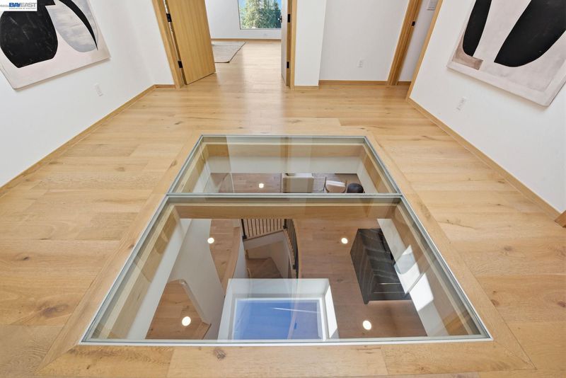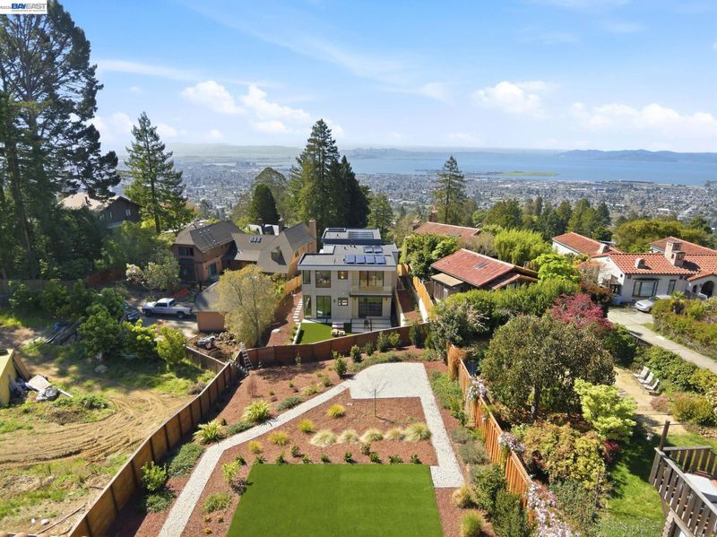 Recently built Berkeley Hills contemporary home with breathtaking panoramic Bay views and ADU. Set on a rare nearly 10,000 sq ft lot. Spectacular sunsets and sweeping vistas can be enjoyed from nearly every room. A dramatic skylight and glass-floor light well bring natural light from the roof through the upper level into the living space below, creating a striking architectural centerpiece and bright open interior. Nearly 12-ft ceilings and a folding glass door system open the living space to expansive decks framing spectacular Bay views. The chef’s kitchen boasts marble counters, Thermador appliances, and a walk-in pantry. Quality craftsmanship defines this residence, showcasing white oak and porcelain tile floors, customized rift oak doors, and top-of-the-line finishes throughout. The serene primary suite features large picture windows and a spa-like bath with radiant heated floors. Rare ~813 sq ft attached ADU with private entrance, full kitchen, living area, and separate meter—ideal for guests, extended family, or rental income. Additional highlights include AC, EV charging, smart switches, 1 GB fiber internet with wired connections in all rooms, a two-car garage, and extra driveway parking. Conveniently located near Albany and North Berkeley shopping, dining, parks, trails.