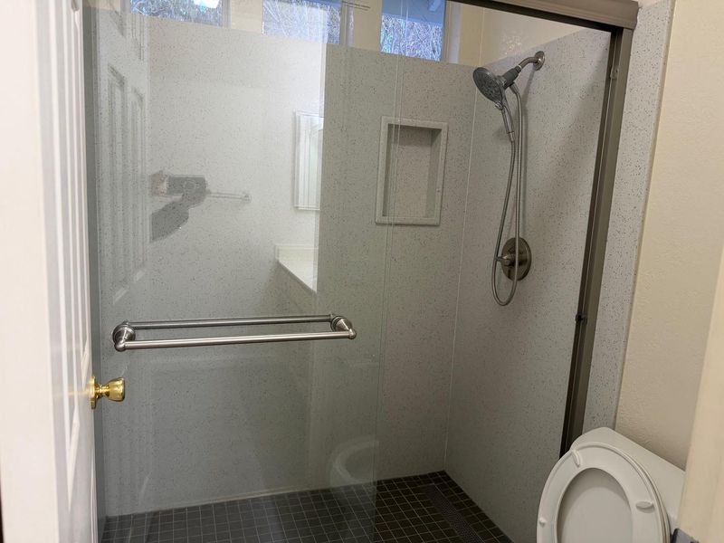 - Double Sinks, Half on Ground Floor, Primary - Oversized Tub, Primary - Stall Shower(s), Shower over Tub - 1, Stall Shower, Tub in Primary Bedroom, Updated Bath