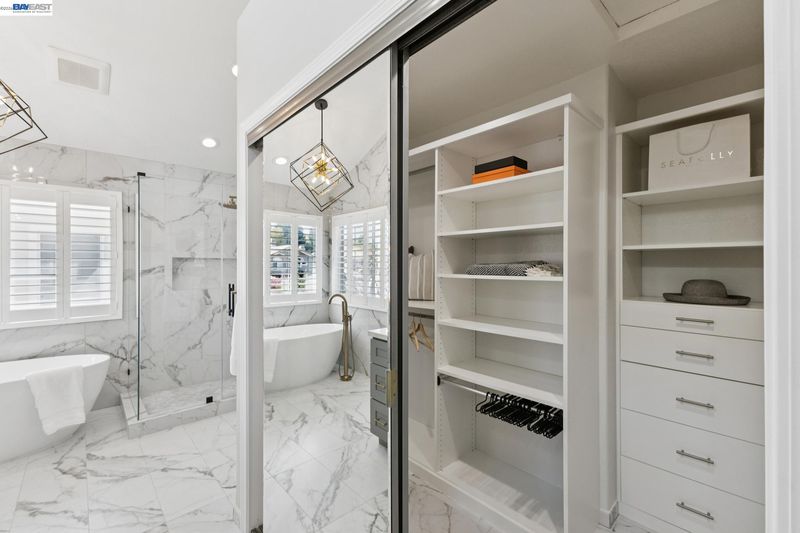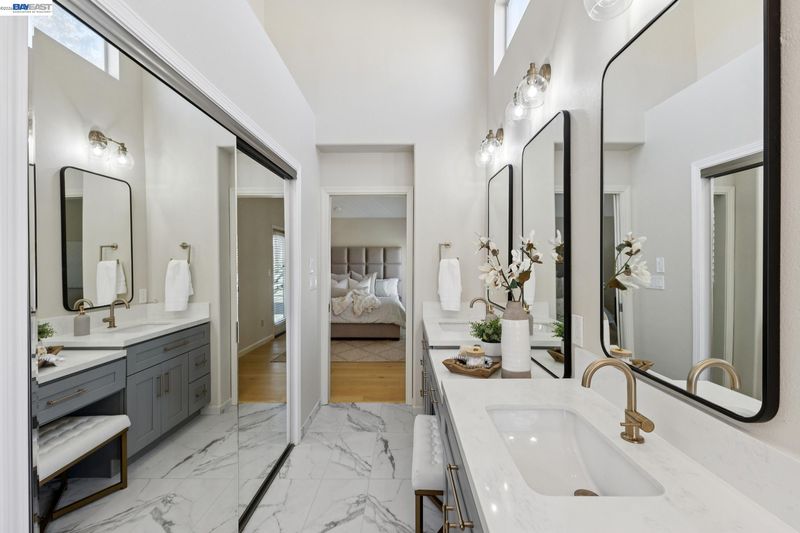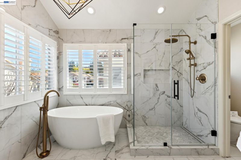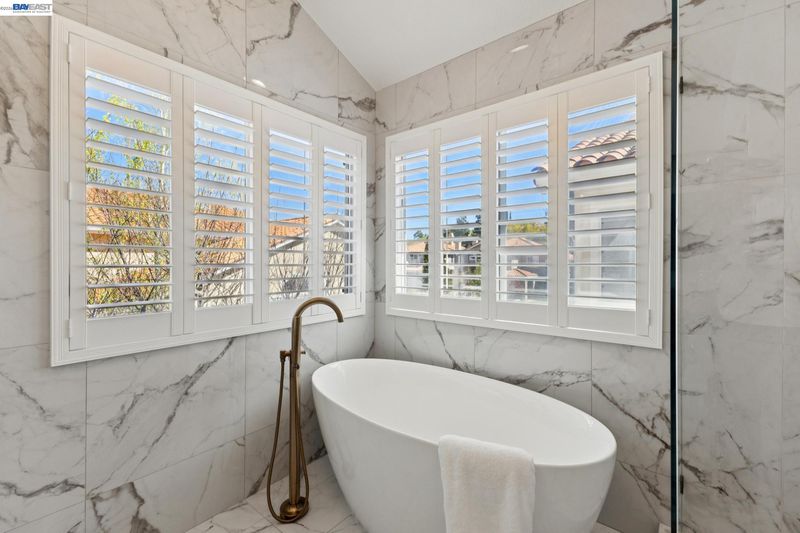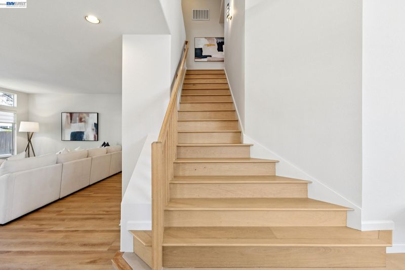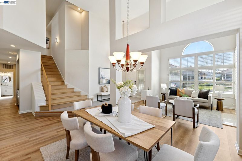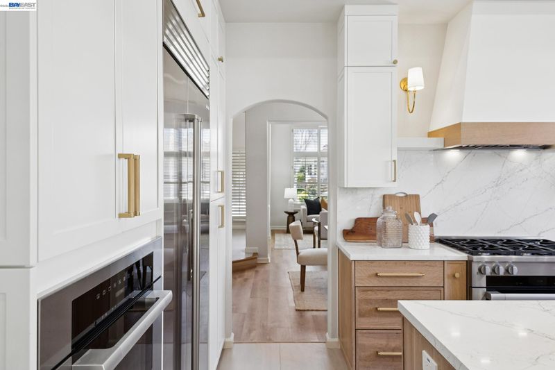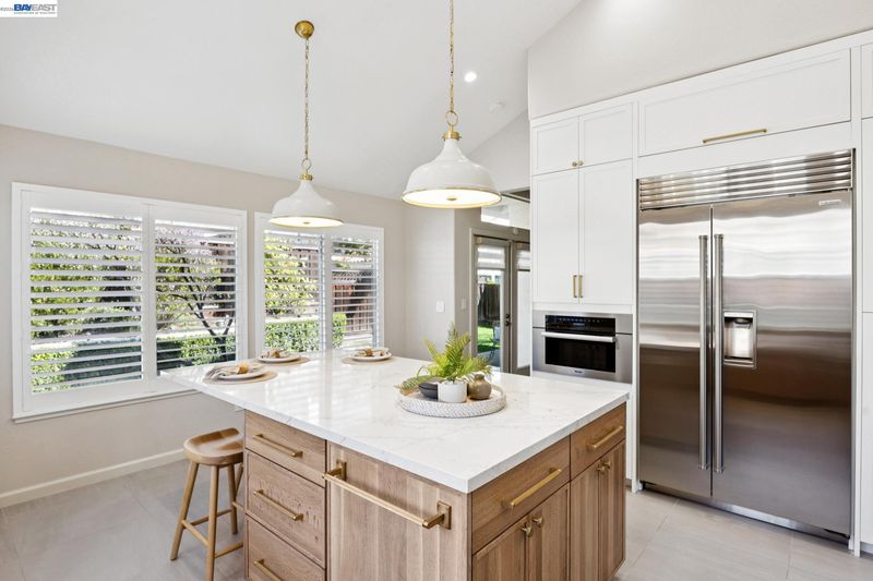 Remodeled modern charmer on a private cul-de-sac lot. Soaring vaulted ceilings, hardwood style LVP and engineered hardwood flooring throughout, elegant formal living room with fireplace and spacious dining room offer inviting space for entertaining. The remodeled gourmet kitchen features quartz countertops, a large center island with bar seating, six-burner gas range/oven combo with custom hood, built-in Sub-Zero refrigerator/freezer, and stainless appliances. The large family room features a gas fireplace and wet bar. The main level includes a bedroom, remodeled full bathroom and a functional laundry room with sink. Upstairs finds a large primary bedroom with vaulted ceiling and private balcony. The remodeled spa-like primary bath is your own private sanctuary, with vaulted ceiling, marble floors and walls, freestanding soaking tub, walk-in shower, dual-sink vanity with makeup station, and large walk-in closet with built-in storage. There are also 3 large secondary bedrooms upstairs, along with a functional hall bath with dual vanity. There is a 3 car garage with an owned solar system and battery backup. The backyard features custom patio areas, lawn, and a spacious side yard. Close to award-winning schools, Mission Hills Park, I-680, the ACE train, and downtown Pleasanton