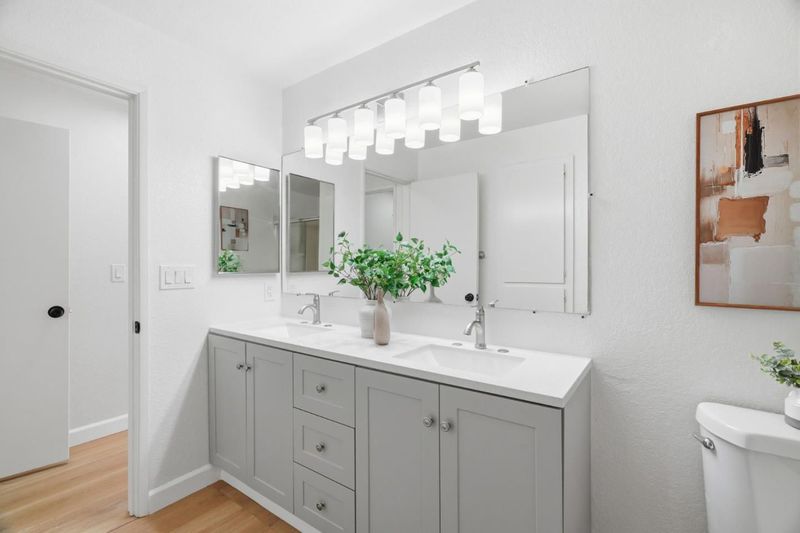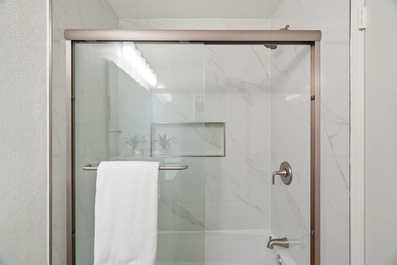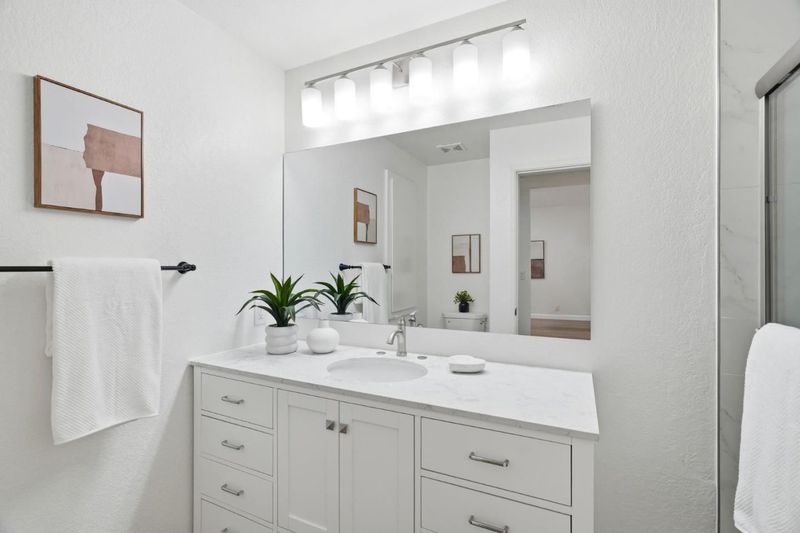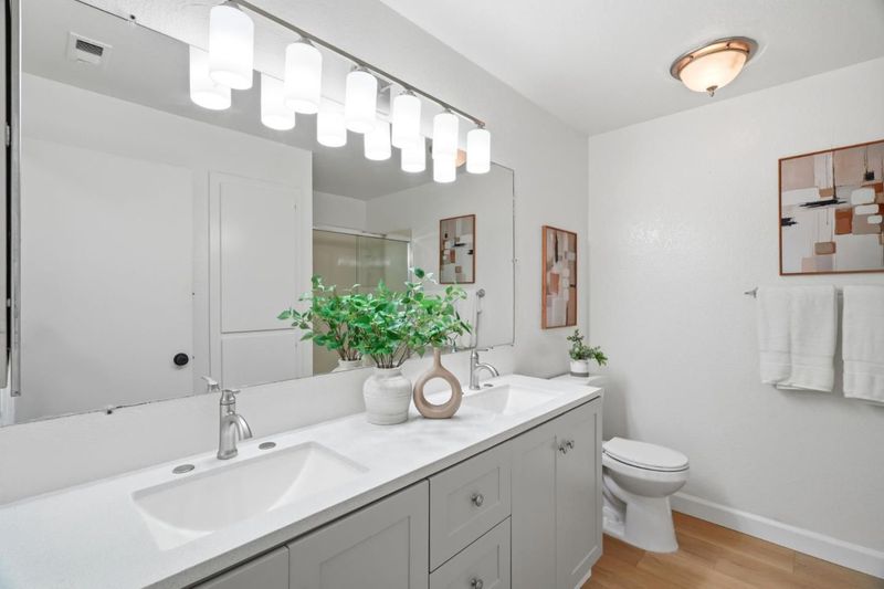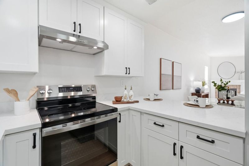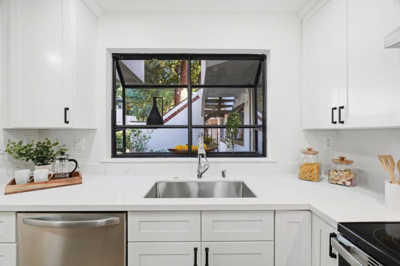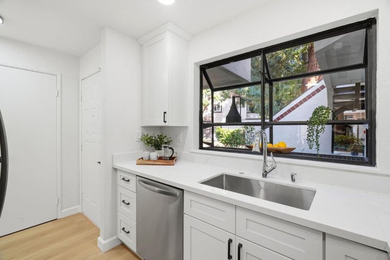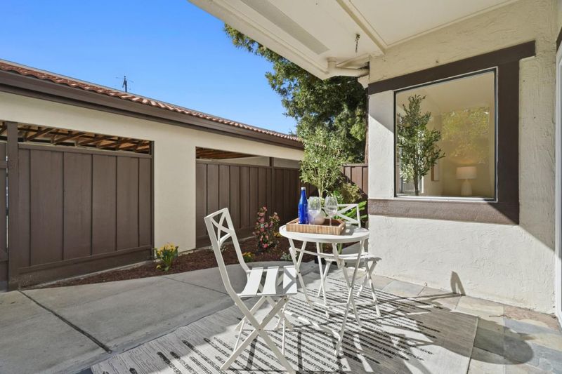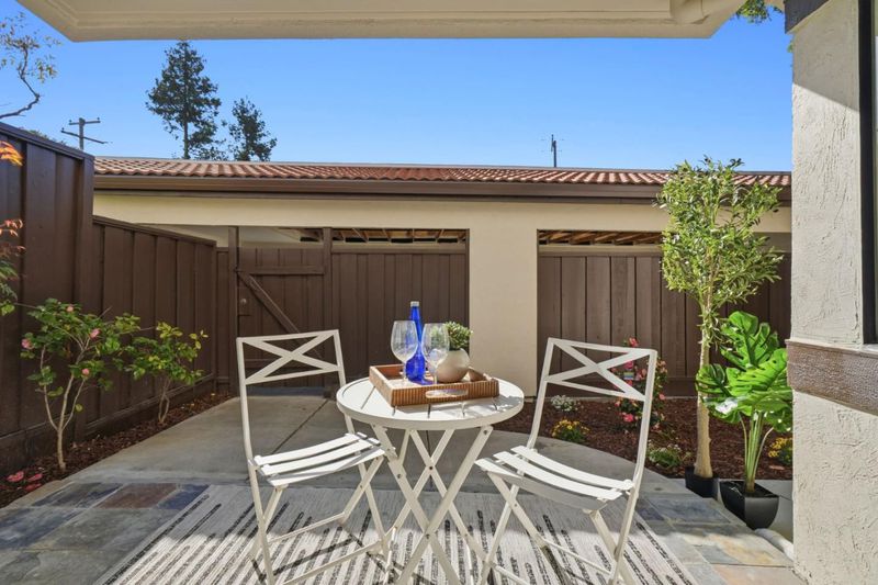 Welcome to Hampton Place, a secure gated community offering a beautifully updated 2-bedroom, 2-bathroom single level lower floor condo with 1,062 square feet. Nestled in a park-like redwood setting with pool, spa, and clubhouse, the community recently completed exterior painting of all buildings. Inside, the home features brand-new kitchen cabinets, quartz countertops, a stainless sink and faucet, all-new appliances including the refrigerator, recessed lighting, and a charming garden window overlooking the grounds. Fresh interior paint and light-blonde waterproof SPC flooring flow throughout and lead to an expansive private backyard patio shaded by towering redwoods with lush plantings, perfect for relaxing or entertaining. The patio gate provides direct access to your assigned covered parking space with nearby guest parking. Both bathrooms have been beautifully remodeled and an in-unit laundry area is included. HOA dues cover water, garbage, sewer, pool and spa, roofs, exterior paint, common areas, and earthquake insurance. Ideally located in the heart of Silicon Valley just minutes to Apple Park, Nvidia, Santana Row, and everyday conveniences including Target, Sprouts, Peets, and Starbucks.