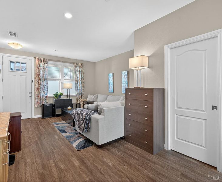 Step inside to this and thoughtfully designed two-story floor plan. Enjoy a seamless blend of living and dining spaces, complemented by three bedrooms and two and a half bathrooms. Timeless accents, recessed lighting, and an abundance of natural light create an ambiance of comfort and style. The kitchen is a dream for any home chef, featuring clean design with dark wood cabinetry, sleek white countertops, a convenient breakfast bar, and a timeless layout that maximizes both function and beauty. Sliding doors lead to a private patio, ideal for intimate outdoor dining, entertaining, or simply relaxing in your own peaceful retreat. Additional highlights include a spacious one-car garage with storage, offering the perfect combination of convenience and practicality. This home is conveniently located, close to everything Sonoma County including nearby shopping, parks, schools, and more. Whether you're lounging on your private backyard patio or enjoying a serene cup of your favorite beverage at the breakfast bar, there's so much to love about this hidden treasure. Don't miss the opportunity to make this home yours!