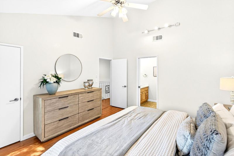 Towering two-story end-unit surrounded by majestic redwood trees, ideally located within a Top-Rated school district and less than two miles from vibrant Downtown Mountain View, known for its lively farmers market, acclaimed dining, shopping, plus convenient Caltrain and light rail access. Inside, the home features laminate flooring, high vaulted ceilings on the second story, recessed lighting, and central heat/AC. The well-appointed kitchen offers stainless steel appliances, granite countertops and a charming bay window that fills the space with natural light. Each bedroom includes its own en-suite bathroom, while the primary suite boasts a spacious walk-in closet with custom organizer and a relaxing sunny balcony. Additional highlights include a generous one-car garage, bonus sunroom leading to a private patio perfect for entertaining or relaxing, and access to a serene community pool. Ideally situated near major tech campuses including Apple, Google and LinkedIn, with easy access to Highways 85, 101, 237 and central expressway, this home perfectly blends lifestyle, convenience and location. Do not miss your chance to own this towering treasure. It will go FAST!
