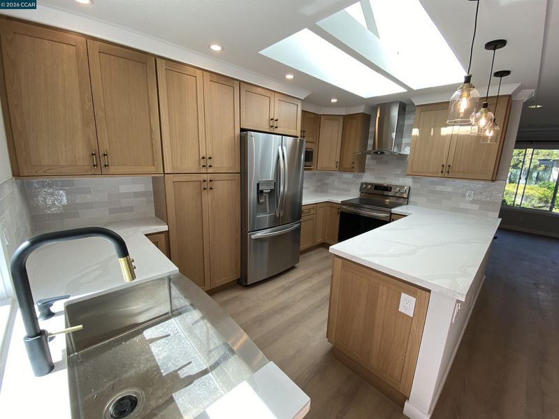 Beautifully remodeled home with high-end finishes and abundant natural light. The custom kitchen features an expansive skylight, American white oak shaker cabinetry, quartz countertops, and new LG stainless steel appliances, including a wine refrigerator. The living room offers a large electric fireplace with custom shiplap surround, solid oak mantel, built-in cabinetry, and TV/HDMI hookups. The expanded primary suite includes a spa-inspired bath with custom marble shower, dual showerheads, skylight, and mirrored closet doors. The guest bedroom features a large reach-in closet, while the updated guest bath offers a marble tub surround, skylight, and additional storage. Additional highlights include recessed LED lighting, coved ceilings, bedrooms prewired for ceiling fans, a laundry closet with GE laundry center, new double-pane windows and French doors, central HVAC with new ductwork, USB-equipped outlets, and a new electrical subpanel. Enjoy a private rear brick courtyard with French doors and a separate entry garden with tile and custom steel gate. All work permitted by Rossmoor MOD and the City of Walnut Creek.