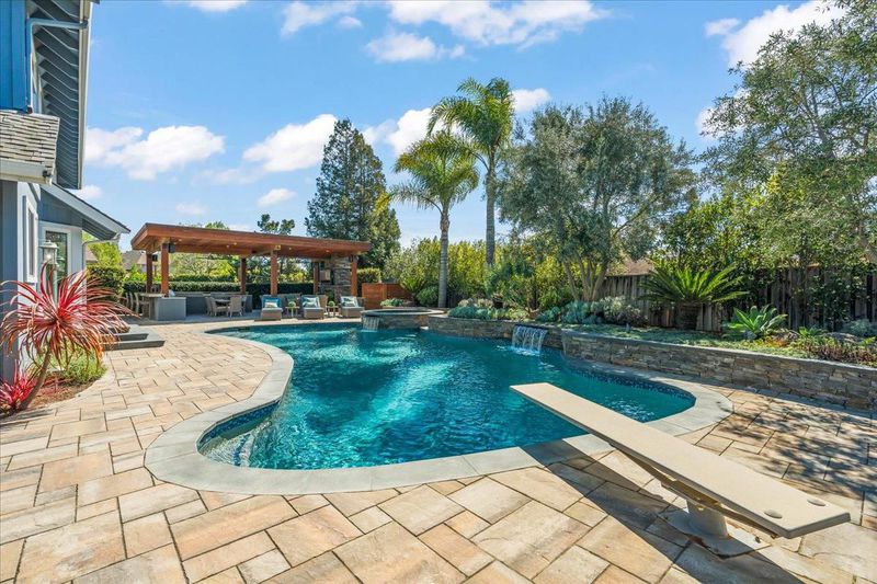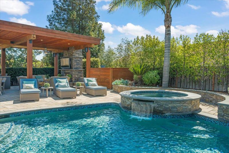 Experience exceptional indoor-outdoor living in this beautifully upgraded home. The incredible backyard is a true retreat, featuring lush landscaping and night lighting for enjoyment into the evening. An elegant bluestone and paver hardscape, bocce court, fire pit, and a fully equipped outdoor kitchen with BBQ, expansive counters and ample seating are a delight. The covered entertainment area with outdoor fireplace and TV creates the perfect setting for year-round enjoyment. The renovated Pebble Tech pool and spa are the perfect addition to this large, private yard, offering space to relax or entertain with ease. Inside, a contemporary design showcases a spacious living and dining room. The kitchen, with granite counters and stainless appliances is open to a light and bright family room with fireplace. Renewal by Andersen windows enhance comfort and efficiency, while owned solar supports both the home and pool. Modern Lutron Caseta lighting adds convenience throughout. The luxurious primary suite is an exceptional large room with three walk-in closets. Spacious secondary bedrooms provide flexibility. Completing the property is an impeccably finished 3 car garage with EV charger, so refined it feels like an extension of the home.