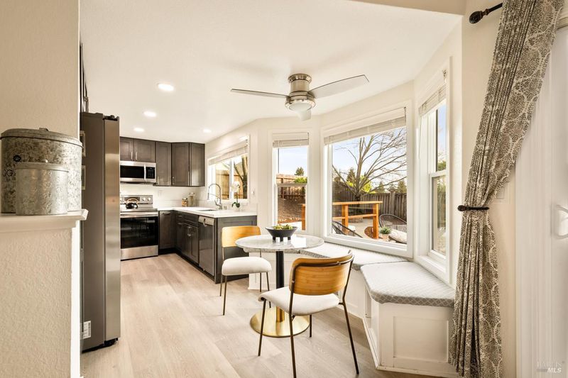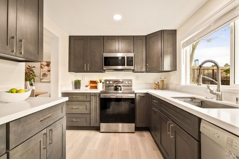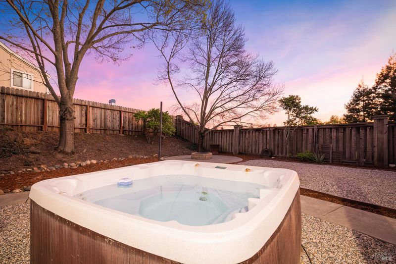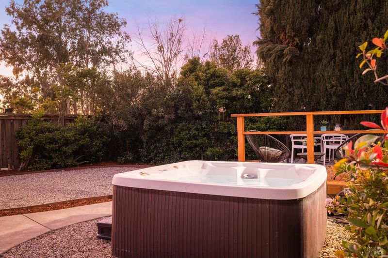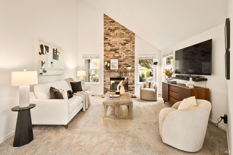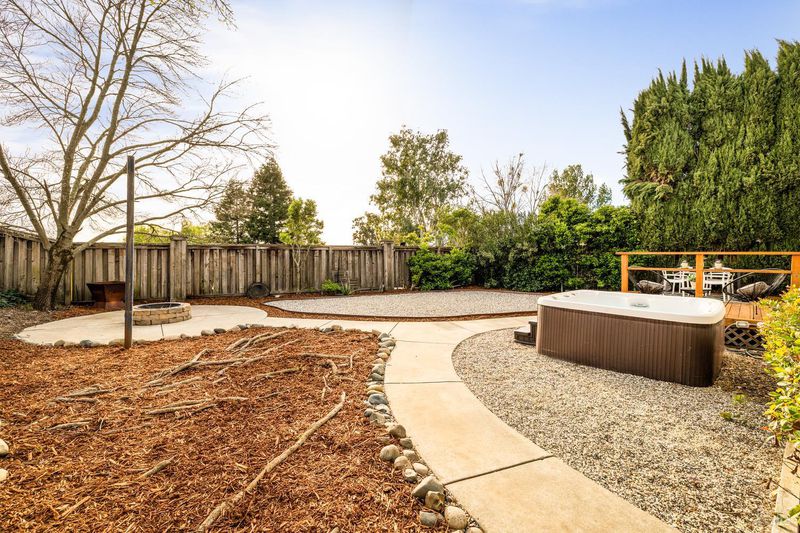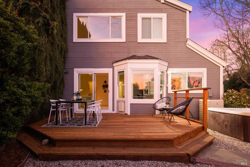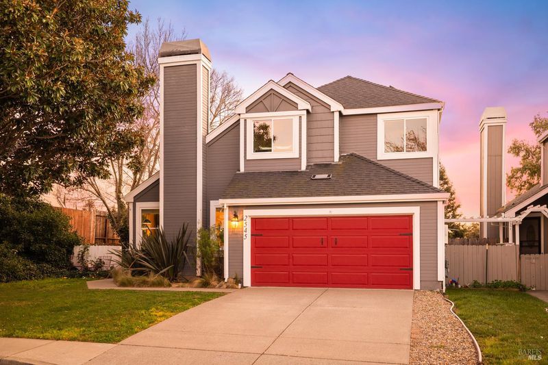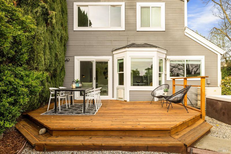 Reached by a lovely winding path through the front garden, this inviting home offers approximately 1,678 sq. ft. of interior living space on an expansive 6,916 sq. ft. lot. A private side entrance opens to a spacious main level featuring elegant wide plank laminate flooring throughout. The living room showcases vaulted ceilings and a dramatic floor-to-ceiling brick fireplace, creating a warm focal point and flowing seamlessly into the adjacent dining area. The beautifully remodeled kitchen features dark shaker-style cabinetry, Quartz counters, stainless steel appliances, recessed lighting, and a charming breakfast nook with banquette window seating that enjoys abundant natural light and views of the rear deck and garden. The kitchen opens directly to a large family room with sliding glass doors leading to the rear deck and spa area, creating an ideal layout for everyday living and entertaining. The main level also includes a conveniently remodeled half bath and a dedicated laundry room. A grand open stairwell leads to the second story where all three bedrooms and two bathrooms are centered around a generous landing at the top of the stairs. The spacious east-facing primary suite enjoys views of the rear garden and features a beautifully remodeled en-suite bathroom with a large walk-in shower with dual shower heads and a double sink vanity. The side yard and east-facing rear garden offer excellent sun exposure and a uniquely private setting away from neighbors, with a winding path defining several planting areas of low-maintenance landscaping before leading to a cozy back corner patio with a fire pit. An expansive rear deck and jacuzzi create the perfect setting for outdoor dining, entertaining, or relaxation. Additional features include solar power, newer dual pane windows, a two-car garage with interior access, and a driveway that accommodates two additional cars. The home is conveniently located close to neighborhood parks, shopping centers, local wineries, Rancho Solano Country Club, and easy freeway access.