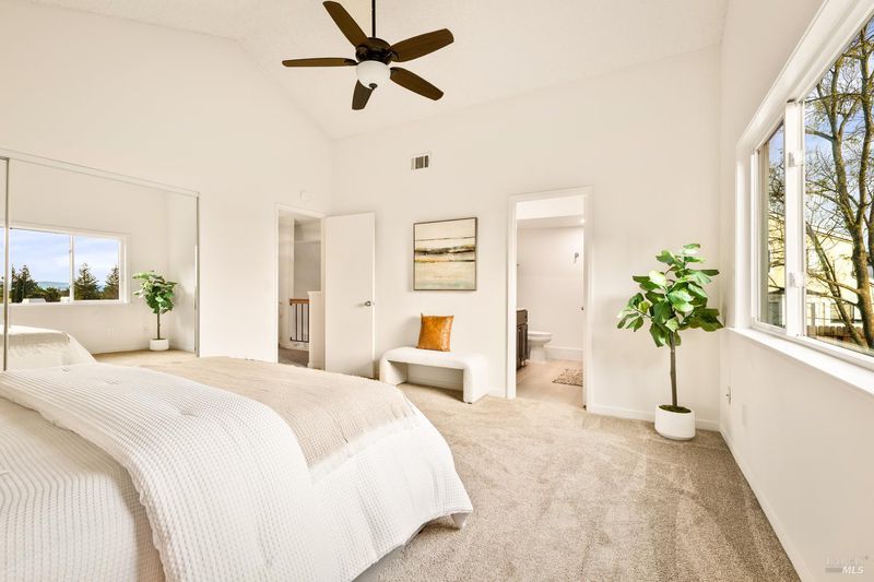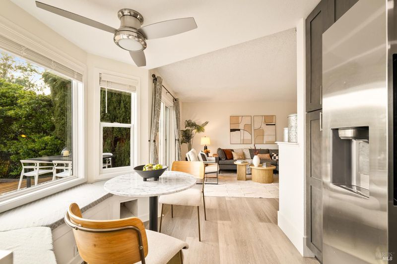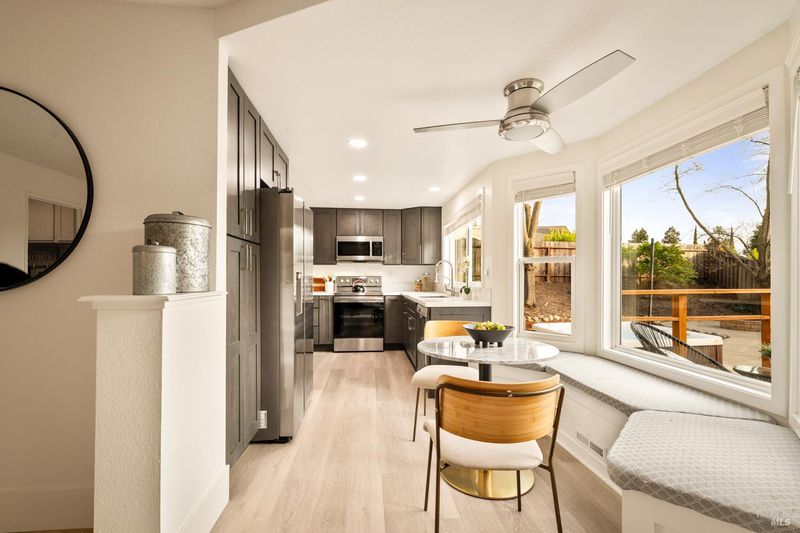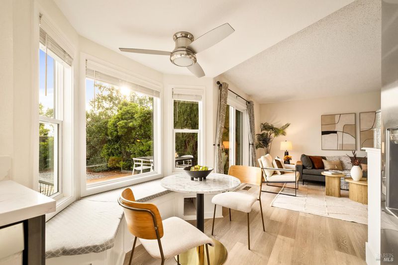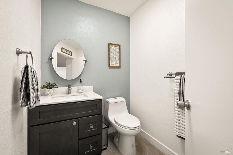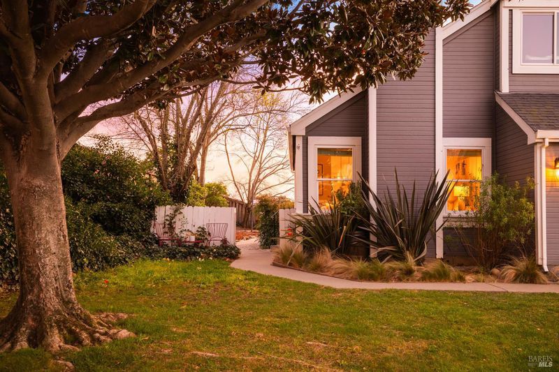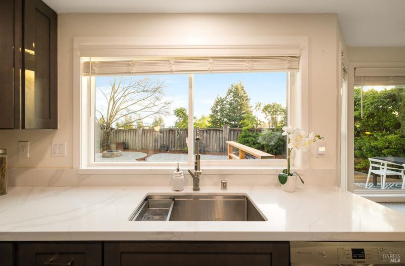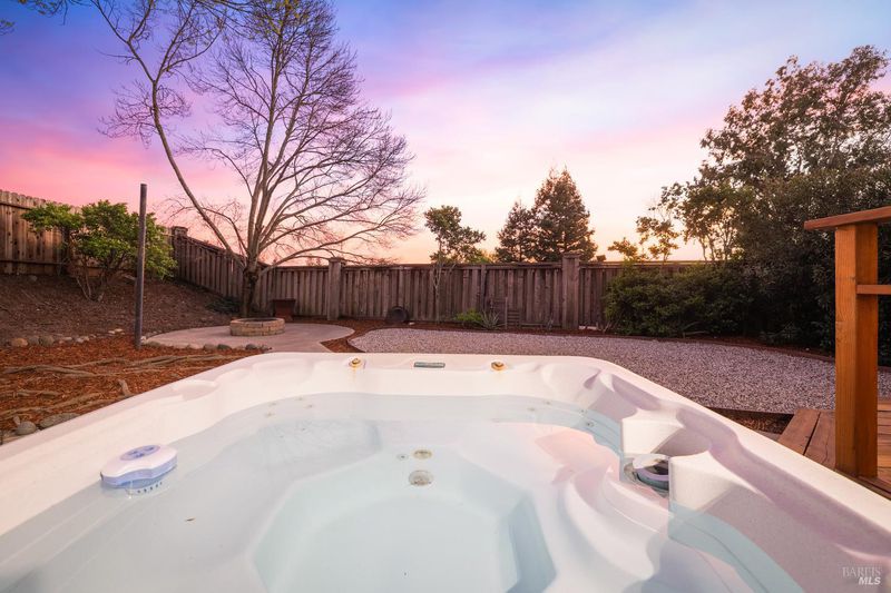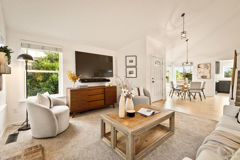 Reached by a lovely winding path through the front garden, this inviting home offers approximately 1,678 sq. ft. of interior living space on an expansive 6,916 sq. ft. lot. A private side entrance opens to a spacious main level featuring elegant wide plank laminate flooring throughout. The living room showcases vaulted ceilings and a dramatic floor-to-ceiling brick fireplace, creating a warm focal point and flowing seamlessly into the adjacent dining area. The beautifully remodeled kitchen features dark shaker-style cabinetry, Quartz counters, stainless steel appliances, recessed lighting, and a charming breakfast nook with banquette window seating that enjoys abundant natural light and views of the rear deck and garden. The kitchen opens directly to a large family room with sliding glass doors leading to the rear deck and spa area, creating an ideal layout for everyday living and entertaining. The main level also includes a conveniently remodeled half bath and a dedicated laundry room. A grand open stairwell leads to the second story where all three bedrooms and two bathrooms are centered around a generous landing at the top of the stairs. The spacious east-facing primary suite enjoys views of the rear garden and features a beautifully remodeled en-suite bathroom with a large walk-in shower with dual shower heads and a double sink vanity. The side yard and east-facing rear garden offer excellent sun exposure and a uniquely private setting away from neighbors, with a winding path defining several planting areas of low-maintenance landscaping before leading to a cozy back corner patio with a fire pit. An expansive rear deck and jacuzzi create the perfect setting for outdoor dining, entertaining, or relaxation. Additional features include solar power, newer dual pane windows, a two-car garage with interior access, and a driveway that accommodates two additional cars. The home is conveniently located close to neighborhood parks, shopping centers, local wineries, Rancho Solano Country Club, and easy freeway access.