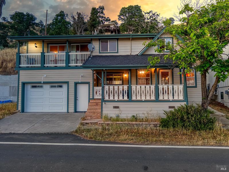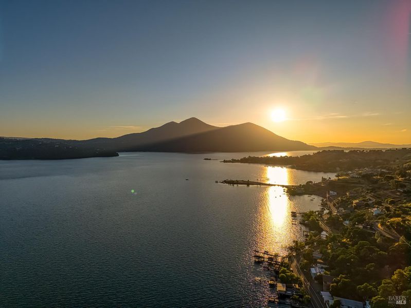 Your Affordable Lake Escape Awaits! Tucked away just five minutes from town, this charming cottage-style lake house offers the perfect blend of comfort, convenience, and tranquility. Set across the street it includes a lakefront lot that has a covered boat dock with lift and pier. It's an ideal retreat for anyone craving a simpler, more peaceful lifestyle. Enjoy stunning sunsets over the water and views of Mt. Konocti from the comfort of your covered front porch. Inside, the cozy living room features cherry wood floors and a wood-burning fireplace on a raised hearth, creating a warm, inviting space. The kitchen is functional and full of charm, complete with lake views right from the sink. A convenient half bath is located downstairs. Upstairs, you'll find three spacious bedrooms with vaulted wood-beamed ceilings and sliding doors that open to a peaceful upper deck, plus a full bath. Out back, a private deck offers serene hillside views. Boaters will love the covered boat lift, pier, and launch access, along with parking for a trailer. Additional features include a new mini split system, 2-car garage with storage & laundry area. This adorable home can be sold fully-furnished for a turn-key vacation getaway, if desired. And at a great price, this allows you the flexibility to make it your own!