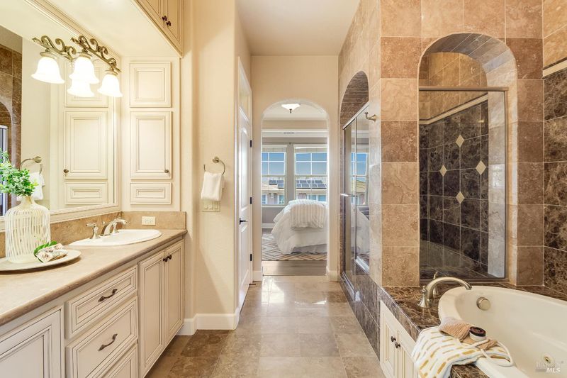 - Double Sinks, Jetted Tub, Shower Stall(s), Walk-In Closet