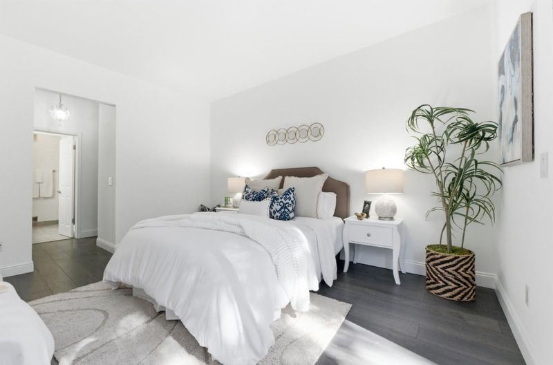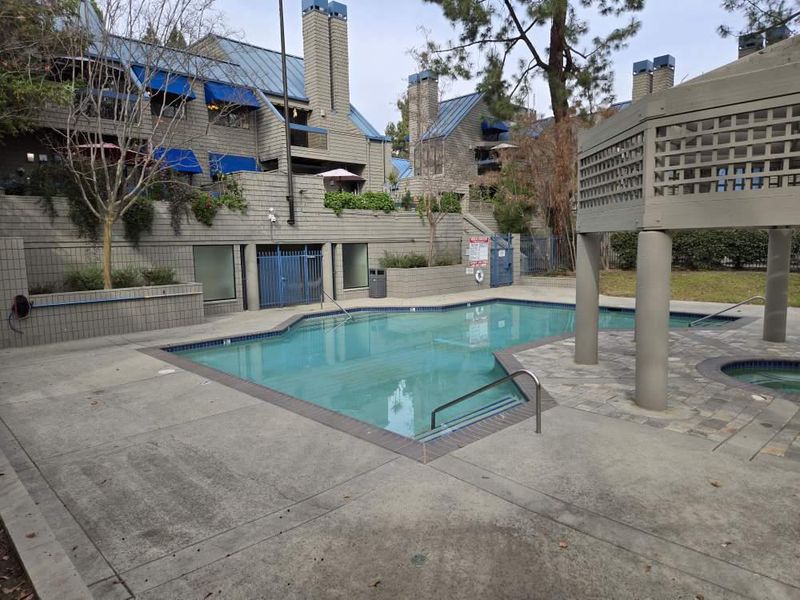 Ground level upgraded 2 bedroom 2 full bath condo with 2 patios. 2 assigned parking lots at covered & gated garage. Contemporary kitchen, upgraded kitchen appliances- Dishwasher, custom Refrigerator & Cabinet Drawers. Open living and dining with wood burning fireplace. Two bedrooms have generous closet space, large size of windows and two private patios offer ample space for outdoor seating or storage, laundry located in hallway between two suites - High quality LG Brand Washer/Dryer. Master bathroom has new deep soaking tub. Nice Pool & Spa fenced privately. Great location for freeway access, Hwy 87 & 85, many restaurants, Whole Foods, Costco, Trader Joes, Oakridge Mall, Ranch 99, etc. This home offers the perfect balance of tranquility and accessibility. Price Reduced!