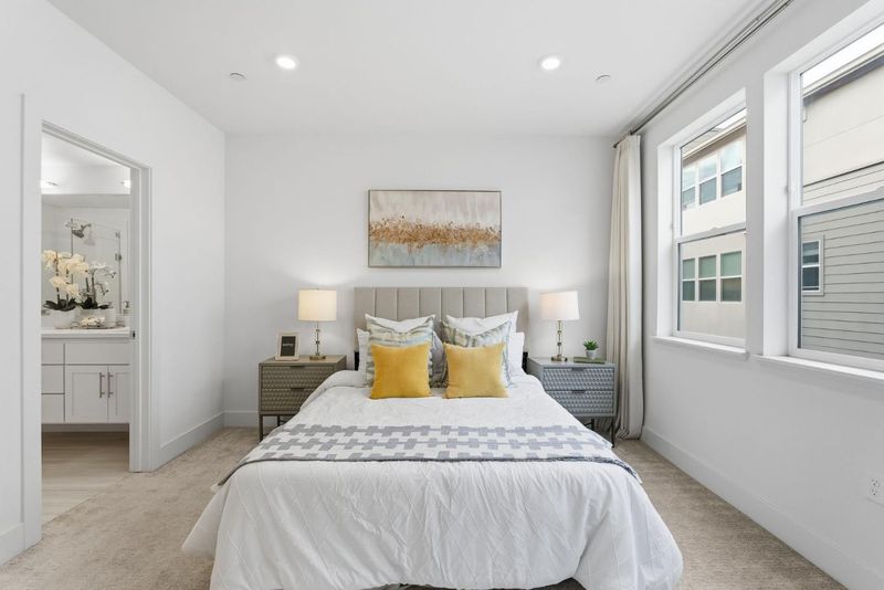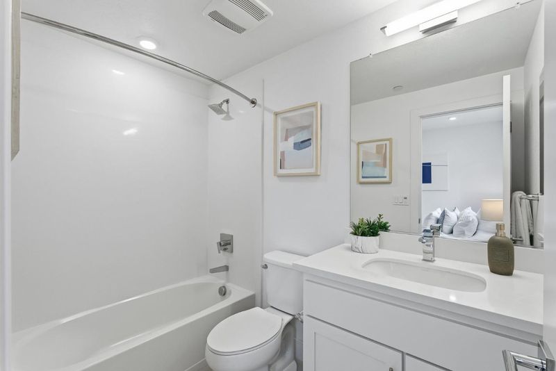Beautifully upgraded modern home in the highly sought-after Nuevo community by award-winning Summerhill Homes with East-facing door. This light-filled residence features an open layout with high ceilings and hardwood floors connecting the spacious living and dining areas, plus a private balcony for easy indoor-outdoor living. The chef's kitchen offers quartz slab countertops, soft-close cabinetry, and stainless-steel appliances with ample counter space. Dual primary suites with en-suite baths provide flexible, private living options. Additional highlights include low Santa Clara utilities, efficient HVAC, a tankless water heater, a fully equipped 2-car garage fitness area, and a water softener. Enjoy community amenities including basketball courts, playground, herb garden, dog park, and bike station. Prime location near Nvidia and Apple, walking distance to Costco and Caltrain, with easy access to Downtown Sunnyvale, Santa Clara Square, Whole Foods, and major expressways.