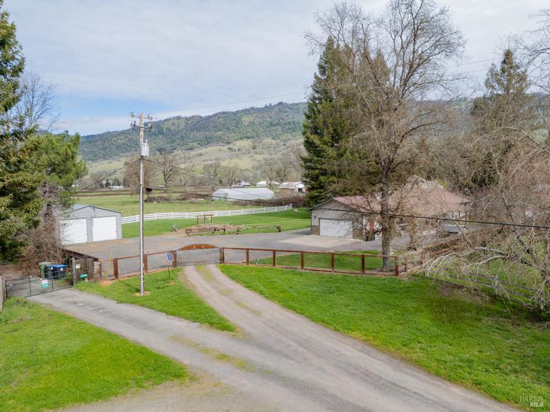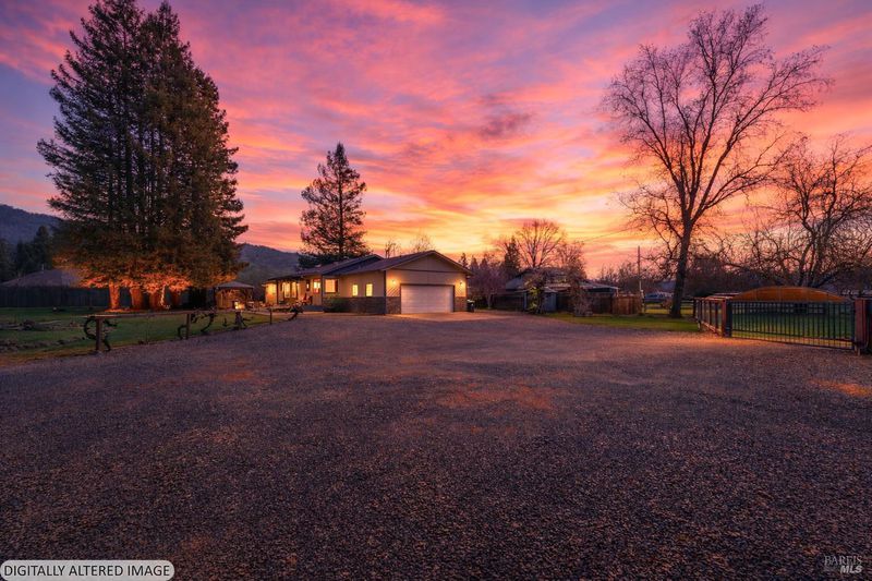 Meticulously maintained and move-in ready 2 acre ranchette. This 4-bedroom, 2-bath retreat blends refined luxury with functional rural living. Rich hickory flooring flows under vaulted ceilings, where an efficient freestanding stove anchors the home with warmth. The primary suite is a true sanctuary, featuring a newly remodeled bath and a walk-in closet, and a sauna located just outside the suite for a convenient spa experience. The grounds are a dream for entertaining and animals alike, boasting an outdoor kitchen nestled among majestic redwoods and sweeping mountain views. Fully fenced and cross-fenced for livestock, the property also includes a versatile metal outbuilding for a workshop or extra parking. Pristine, scenic, and ready for you.