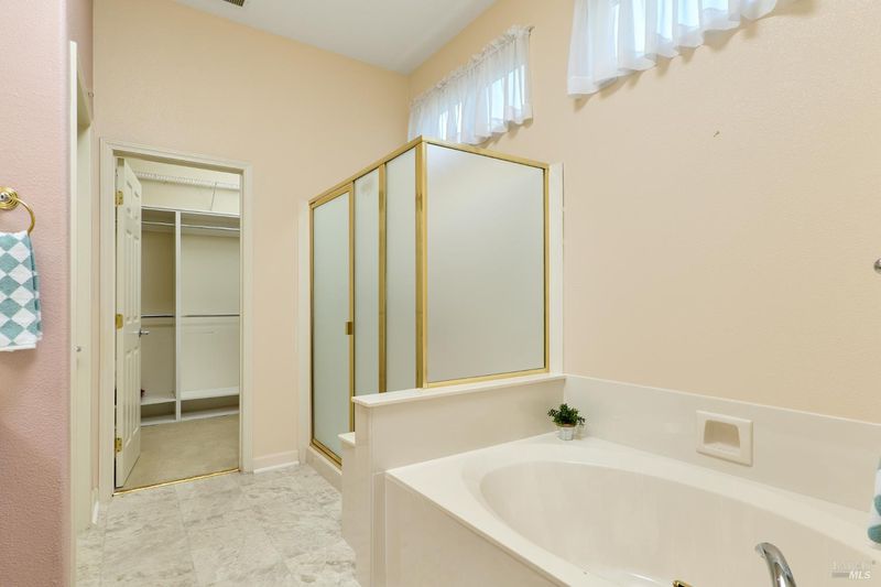 - Double Sinks, Shower Stall(s), Soaking Tub, Walk-In Closet