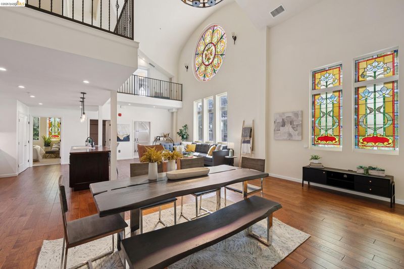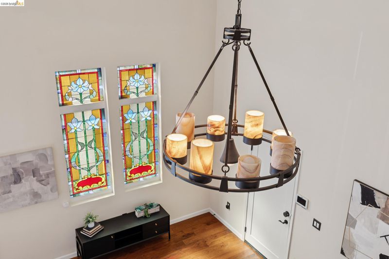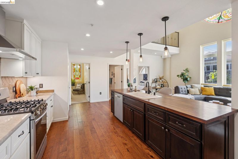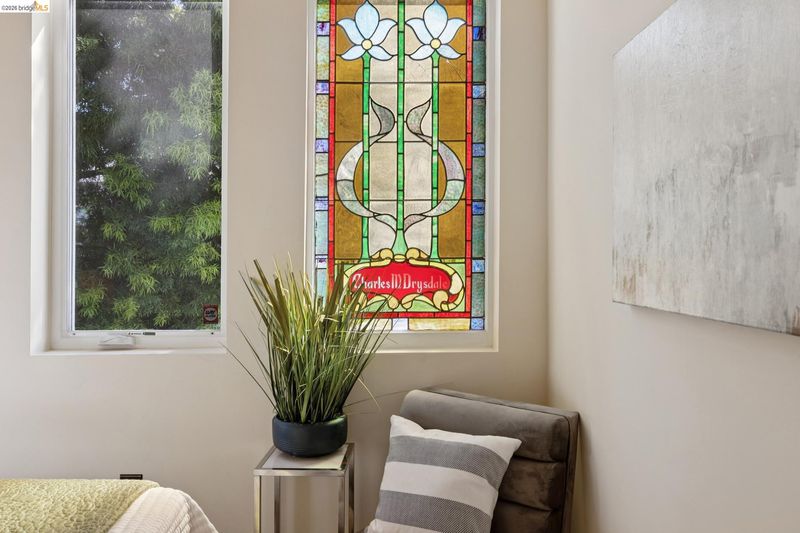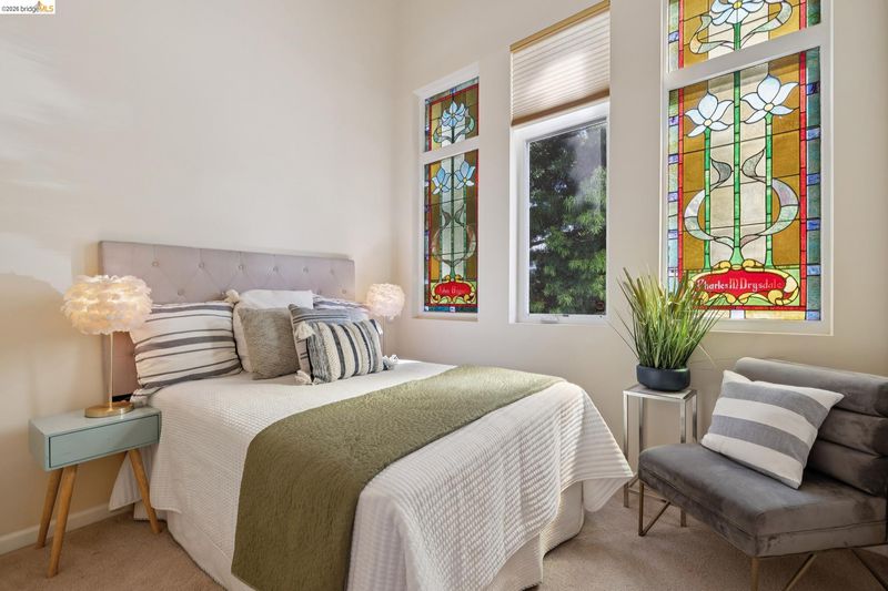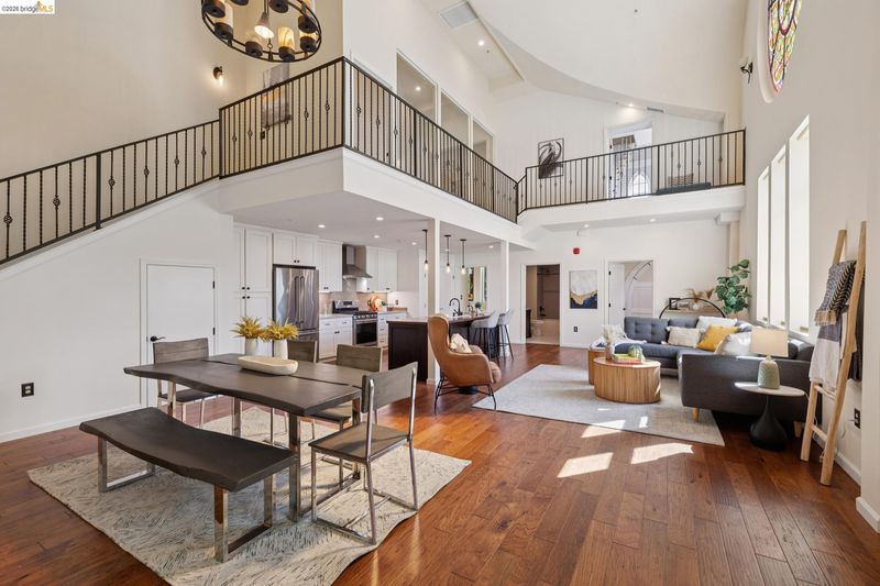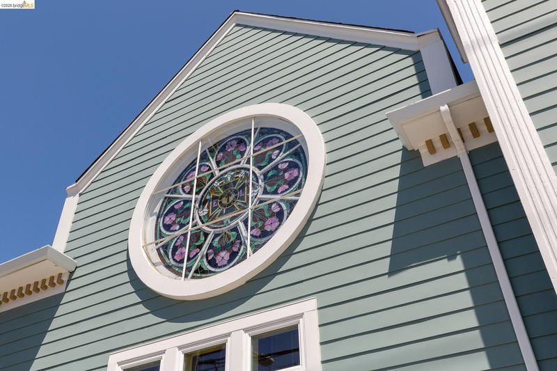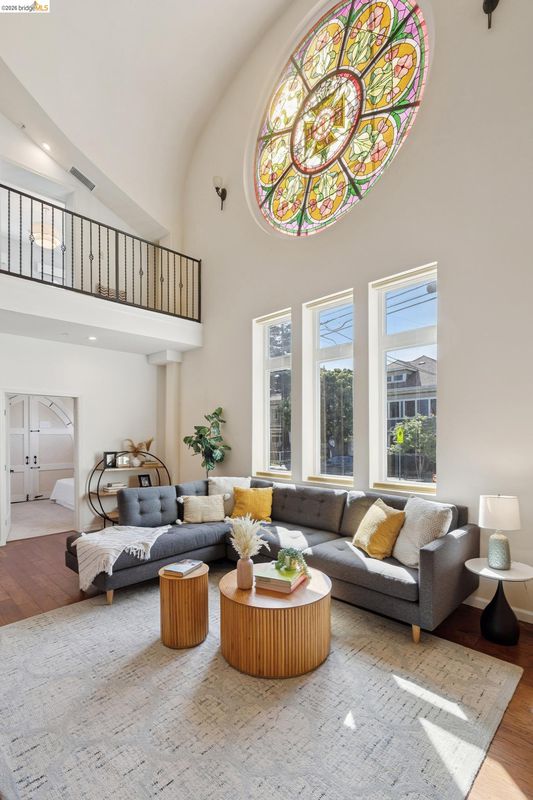 This distinctive condominium is part of a dramatic church conversion in the heart of Bushrod. Soaring ceilings and original stained-glass windows fill the home with natural light, blending historic character with modern design. The open kitchen features a substantial butcher-block island and contemporary finishes, flowing into generous living and dining areas. Two bedrooms and a full bath are located on the main level, while the upper level offers a spacious primary suite, a bright bonus workspace with a wall of glass, and access to a private rooftop deck. Gated parking, in-unit laundry, storage, and secure package delivery add everyday convenience. Walk Score 92 with easy access to Rockridge, Elmwood, and BART.