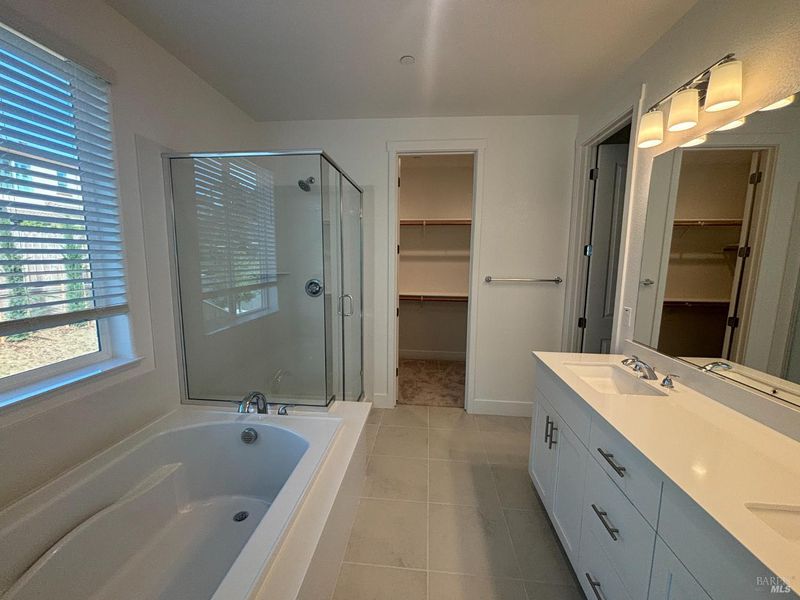 - Double Sinks, Shower Stall(s), Soaking Tub, Walk-In Closet