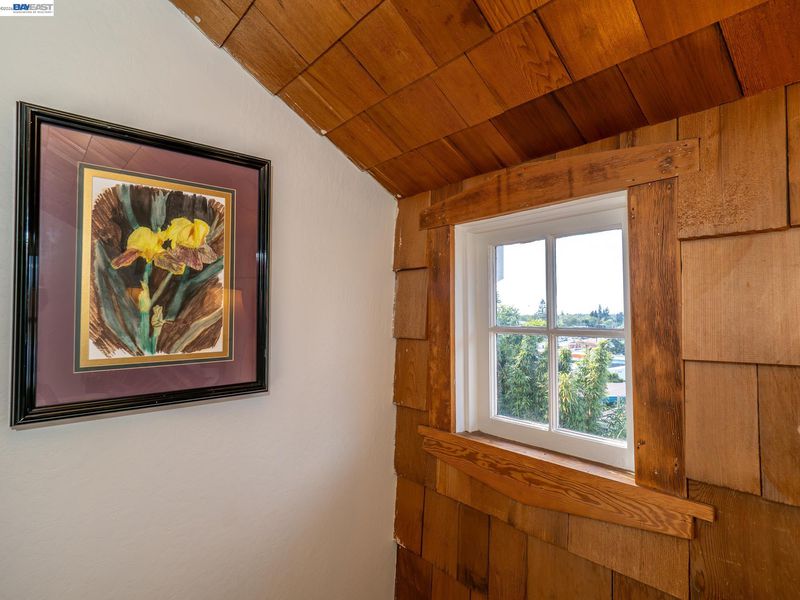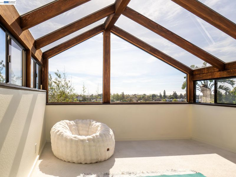 CALLING ALL ENTERTAINERS! Downtown classic in the historic Prospect Hill neighborhood has hosted wedding receptions, political/charitable fundraisers, National Night Out and other unique events. Medieval-style arched doors, wood-burning floor to ceiling brick fireplace, sunset/city lights views, random plank hardwood, Guinevere balcony, glass-ceiling sunroom for sunrise/sunset yoga, cobalt blue-tiled galley kitchen and a remodeled guest level with separate entrance. An art/music studio is part of the home with its own entrance and can be returned to bedroom use. The home is equipped with solar, EV charger, new HVAC, newly remodeled bathrooms with heated toilet seat/towel bars & heated tile flooring, double-level rear deck overlooking a mini-bamboo forest in the "wealth" section of the property, plus occasional wildlife (deer, etc.) Blocks from the cinema, live theater, music venues, shopping, coffee, restaurants, city hall, post office, farmers market, library & BART. Prospect Hill has been home to many city leaders including mayors, city council members, commissioners and prominent business people. Prospect Hill has kept its tradition of respecting the history of Hayward and the neighborhood has angled to be the first neighborhood designated historic in the City of Hayward.