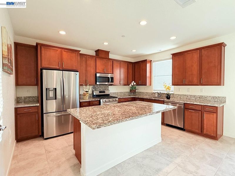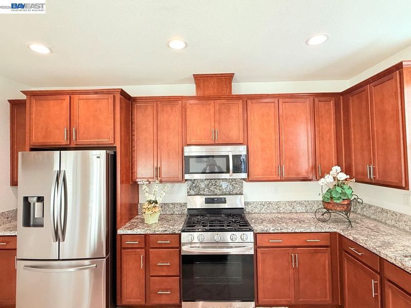 - Dishwasher, Gas Range, Plumbed For Ice Maker, Microwave, Free-Standing Range, Refrigerator, Stone Counters, Eat-in Kitchen, Disposal, Gas Range/Cooktop, Ice Maker Hookup, Kitchen Island, Pantry, Range/Oven Free Standing, Updated Kitchen