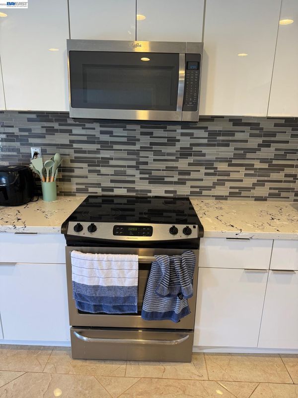 - Dishwasher, Electric Range, Microwave, Refrigerator, Dryer, Washer, Gas Water Heater, 220 Volt Outlet, Stone Counters, Electric Range/Cooktop, Disposal