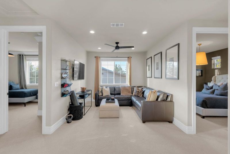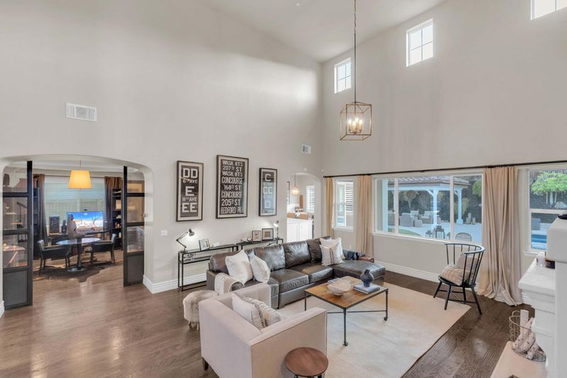 Nestled inside the gates of Eagle Ridge Golf Club, this former builders model home offers 3,206 sq ft of upgraded living on a 12,000 plus sq ft lot. The home features extensive designer enhancements along with an additional $300,000 in renovations. The chefs kitchen includes gas cooktops, quartz countertops, an island with a sink, state of the art appliances, and two wine refrigerators. The layout offers four bedrooms, including lower level primary bedroom with spacious walk in closet and additional junior suite. Bathrooms have been updated with quartz counters, upgraded marble mosaic walls, and double sinks. The main primary suite includes a custom walk-in closet with built-in organizers, a chandelier, soaking tub, and walk-in shower. Upstairs features two additional bedrooms, a loft that can converted to a fifth bedroom, and a balcony with neighborhood views. Additional highlights include high ceilings, an inside laundry room, a welcoming fireplace, and a finished three car garage with polished epoxy flooring and an EV hookup. The backyard is ideal for entertaining with an in-ground fiberglass pool, a covered California patio, and a pergola lounge area. A rare offering that blends comfort, elegance, and significant upgrades, experience the best of Eagle Ridge living.