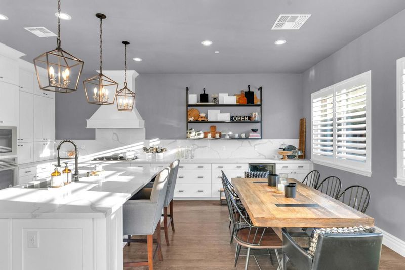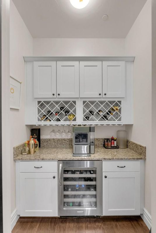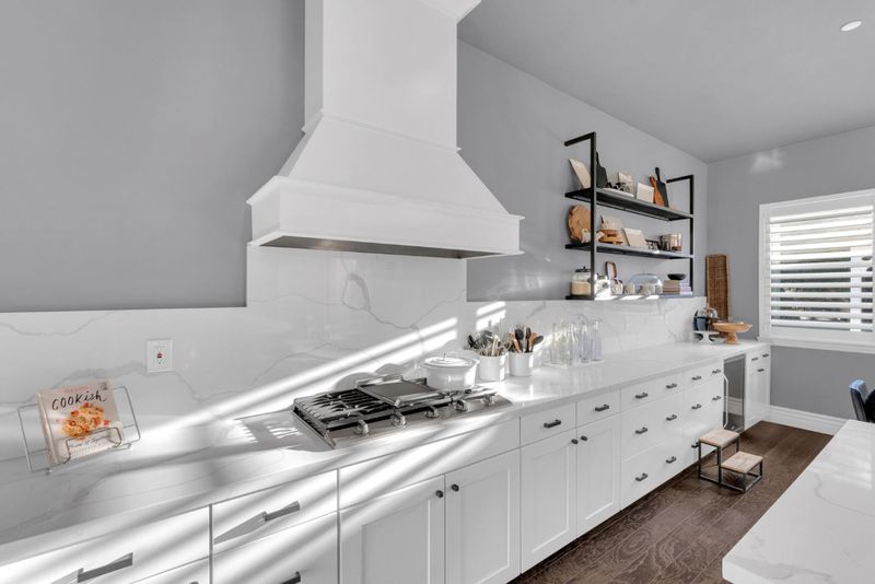 - Cooktop - Gas, Countertop - Quartz, Dishwasher, Exhaust Fan, Garbage Disposal, Island with Sink, Microwave, Oven - Gas, Oven Range - Gas, Pantry, Refrigerator, Wine Refrigerator