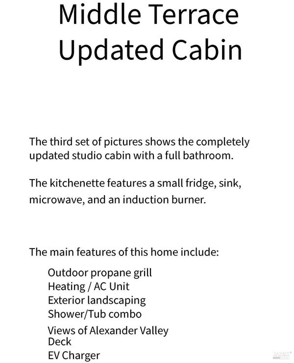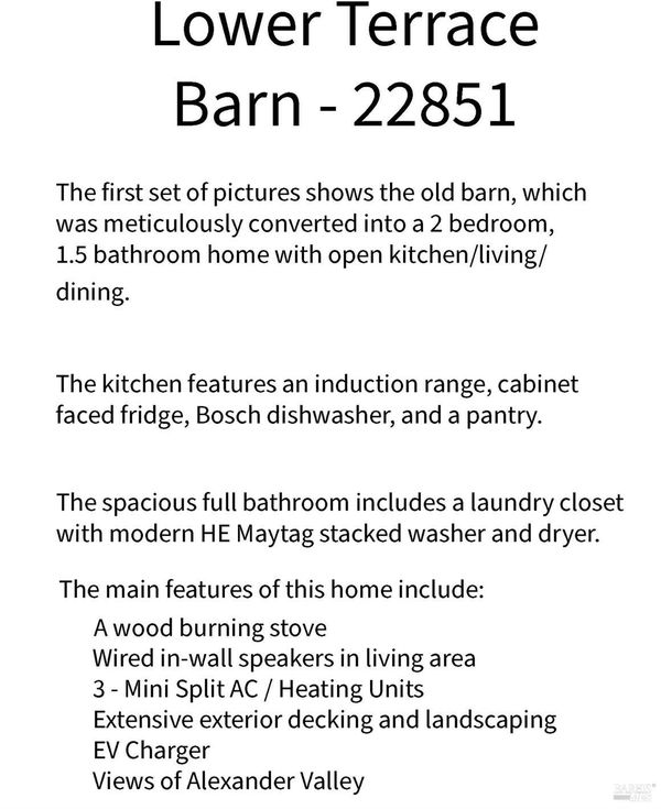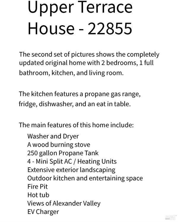 Alexander Valley Hillside Enclave - Three Turnkey Structures on approximately 16 Scenic Acres Welcome to this completely reimagined and beautifully updated hillside property, set on approximately 16 acres above Geyserville in the heart of the Alexander Valley. Thoughtfully terraced across three distinct levels each with its own ambiance, amenities, and privacythis exceptional property is currently operated as a successful short-term vacation rental and offers remarkable flexibility for investors or anyone seeking a dream Wine Country retreat. EV Chargers at each dwelling unit. Lower Terrace Barn - 22851 Chianti Road The fully renovated barn residence combines rustic character with modern design. Featuring concrete floors, 2 bedrooms, 1.5 baths, an open-concept kitchen, living, and dining area, plus a washer and dryer, this home flows seamlessly to beautifully landscaped outdoor living spaces. Upper Terrace House - 22855 Chianti Road The refreshed original home offers 2 bedrooms, 1 bath, a full kitchen, living room, and in-unit laundryperfect for guests, extended family, or continued rental use. There is an outdoor kitchen, hot tub, pergola, and deck - making the perfect outdoor entertainment space. Middle Terrace Cabin A charming studio cabin provides one bath, a kitchenette, and an outdoor grill, creating a cozy standalone getaway. Turnkey and thoughtfully curated, this estate is ideal as an income-producing rental operation, a multi-home family compound, or a private Wine Country sanctuary. Come experience its beauty and make it your own!