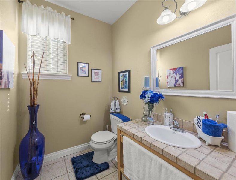 - Double Sinks, Full on Ground Floor, Half on Ground Floor, Primary - Oversized Tub, Primary - Stall Shower(s), Shower and Tub, Stall Shower - 2+, Tile, Tub in Primary Bedroom
