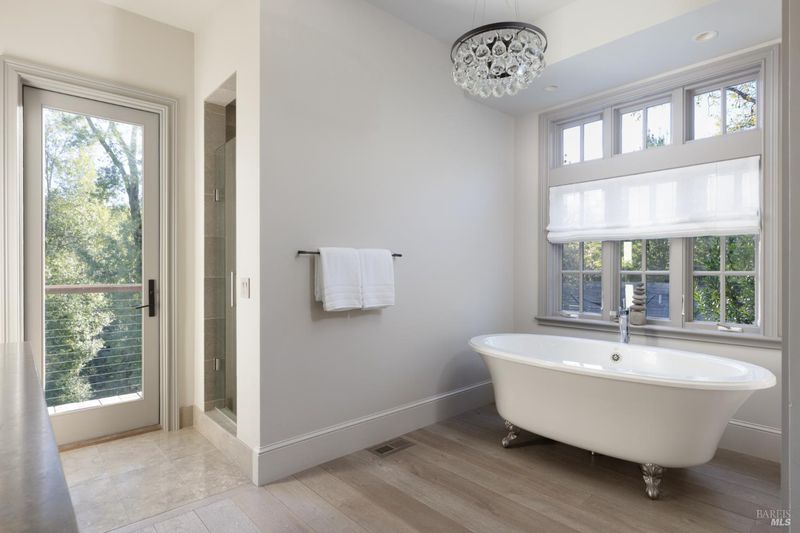 - Double Sinks, Outside Access, Shower Stall(s), Soaking Tub, Stone, Tile