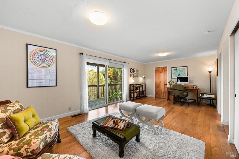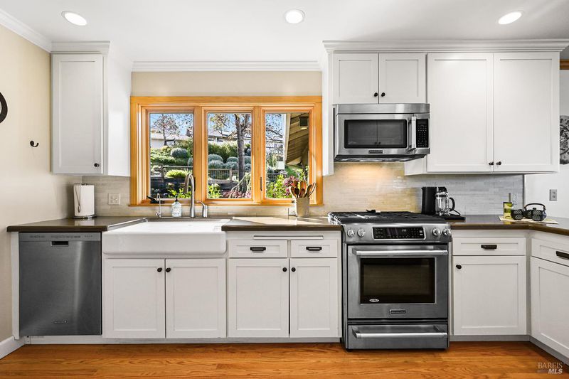 Located in one of the friendliest and most peaceful neighborhoods of San Anselmo, this beautifully crafted and updated home invites you to enjoy effortless indoor and outdoor living at its finest. Panoramic views of the bay and city lights are inspiring and enjoyed from the interior of the home and the large deck stretching across the rear of the home. With four bedrooms and three baths the versatile and flexible floorplan allows for the full enjoyment of your needs. The entry level of the home features three bedrooms including an inviting master suite, two baths, bright and sunny living room with a wood burning fireplace, formal dining room, kitchen and separate family room all enhanced by beautiful oak flooring and crown moldings. The modern and updated kitchen features Architect Series KitchenAid appliances and opens to the family room with an impressive 78'' Samsung OLED television and Sonos soundbar. The dining room, living room and master suite all feature Anderson sliding glass doors that open to the wood deck with its expansive views. Downstairs is a large bonus room, the fourth bedroom, full bath, and large private deck. The attached two-car garage has extensive built-in cabinetry, work area, epoxy floors and a Siemens car charging station. The home includes a 5.8kW solar system (owned not leased), central heating and air-conditioning. A stunning front courtyard framed by lush, professionally landscaped gardens provides an elegant, welcoming outdoor environment that sets the tone for the entire residence. Located in the outstanding San Anselmo school district including Hidden Valley Elementary, the home is near parks, and trails that provide endless access to hiking and mountain biking. Enjoy the lovely towns of San Anselmo and Fairfax from this lovingly maintained home. Not to be missed, come home to San Anselmo!