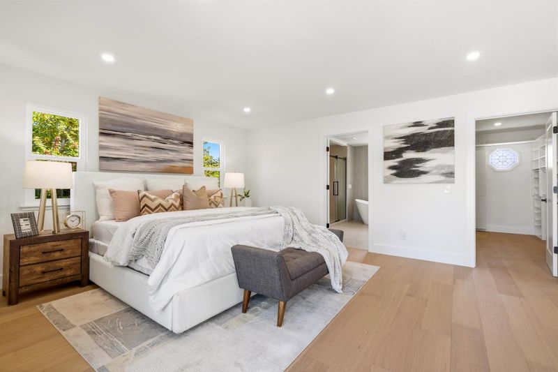Thoughtfully reimagined, this stunning residence offers a perfect blend of sophisticated design and comfortable everyday living. Sunlight fills the homes open and inviting interior, highlighting new engineered hardwood flooring, fresh interior and exterior paint, custom trim and baseboards, new doors, and elegant designer lighting throughout. At the heart of the home, the beautifully redesigned kitchen features stylish new cabinetry, stainless steel appliances, updated fixtures, skylight, and a generous island ideal for gathering. The flexible layout provides space to relax and entertain - find solace in the additionally family room upstairs. The spacious primary suite offers a private escape complete with a walk-in closet, soaking tub, and separate shower. Additional upgrades include new sliding doors, and a sleek electric fireplace set against a custom wood accent wall. The finished two-car garage features an epoxy-coated floor for a polished touch. Set along a peaceful tree-lined street, this home offers exceptional convenience just minutes from the Municipal Rose Garden, Santana Row, Valley Fair, and major commuter routes to Silicon Valley.